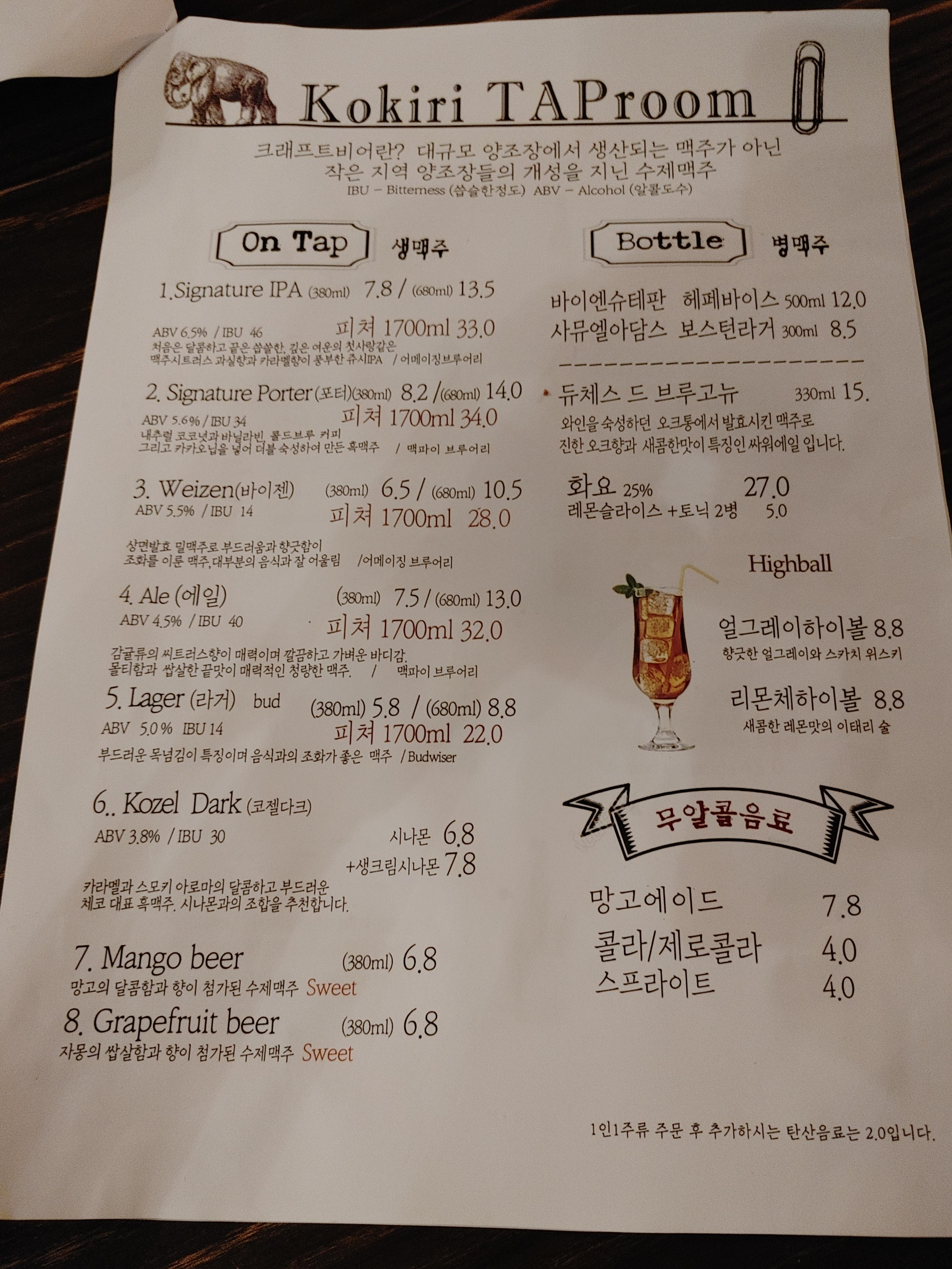2. 코끼리탭룸 메뉴 가격