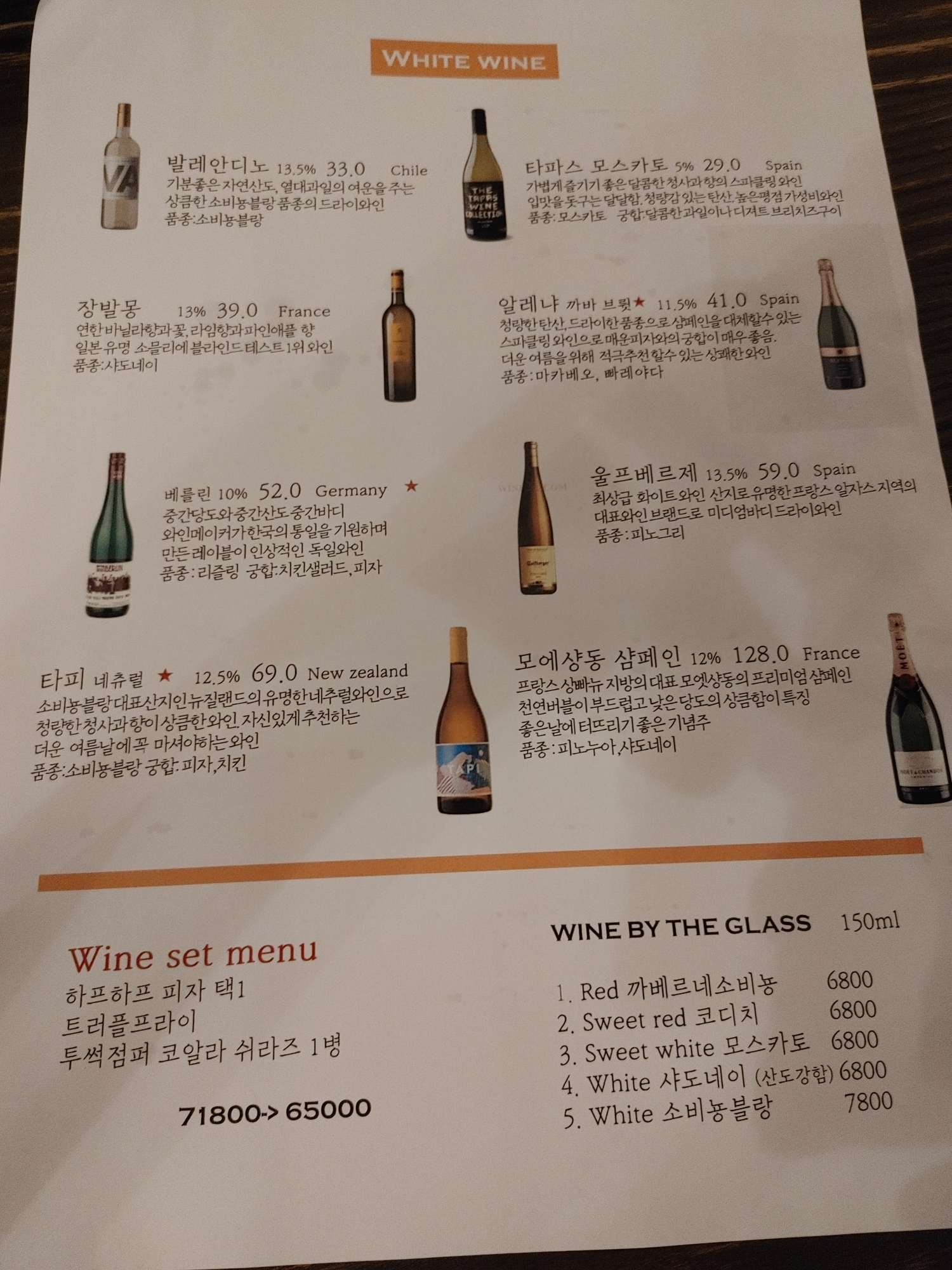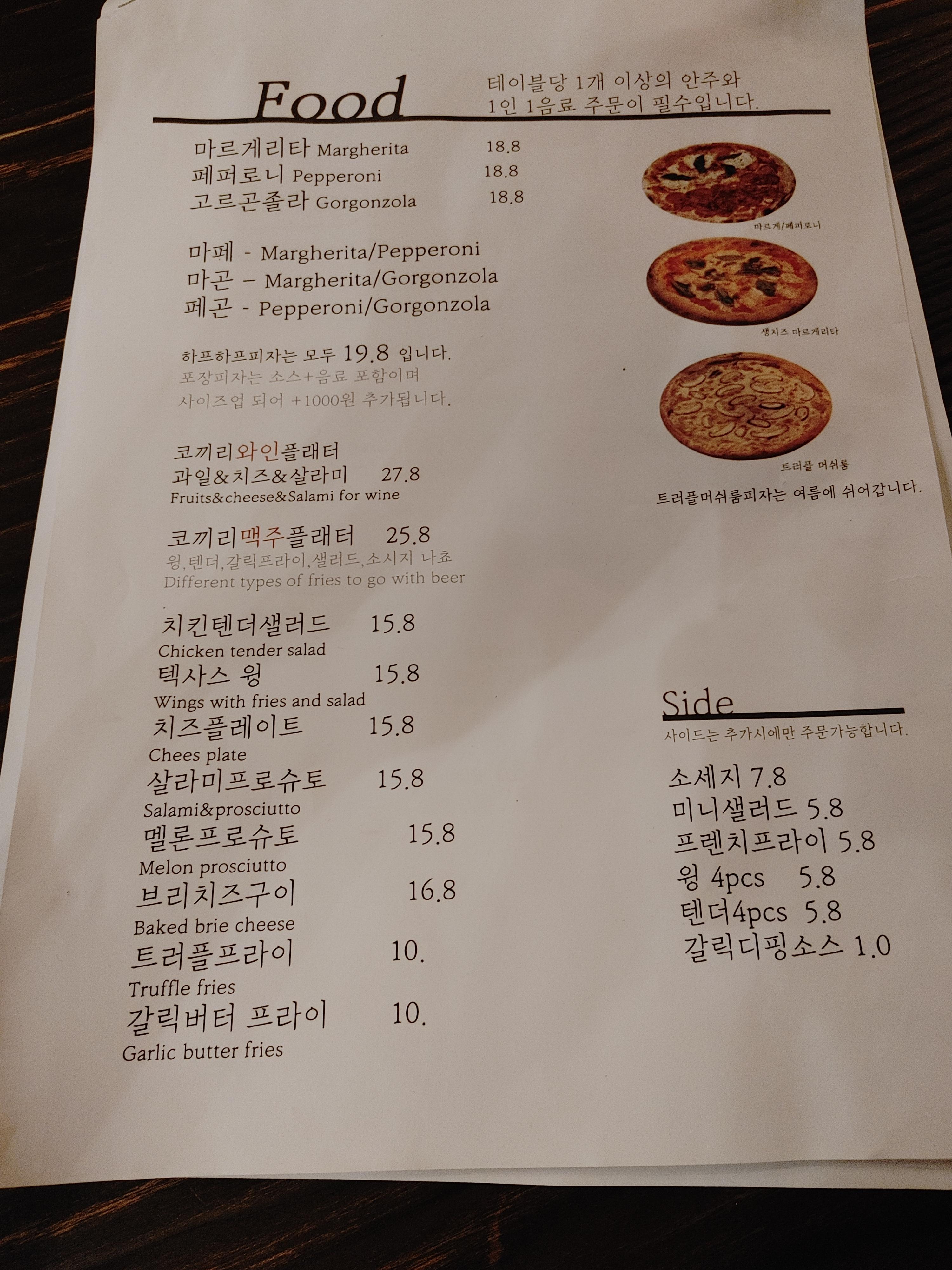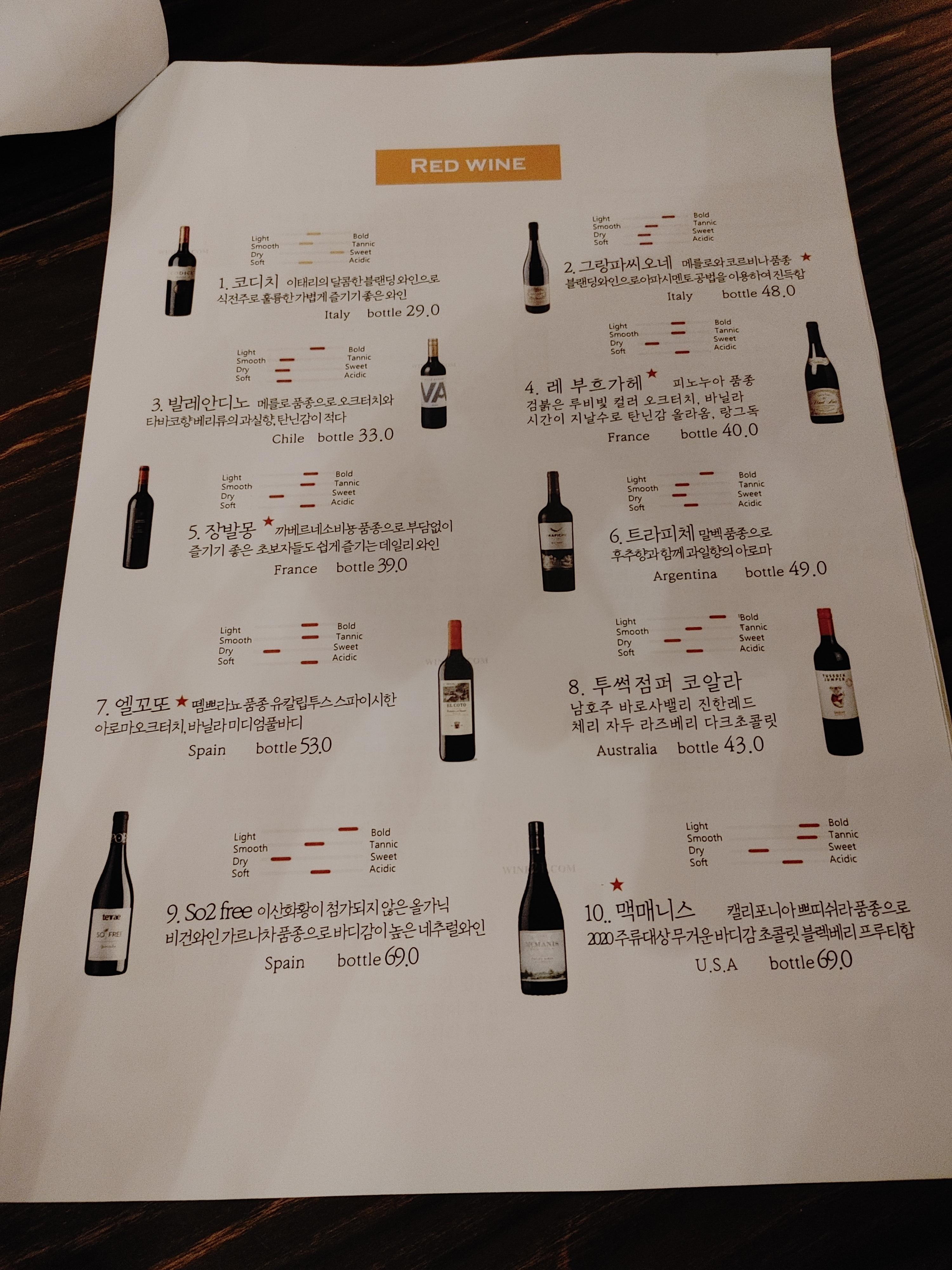 메뉴판은 총 4장이었다. 안주류, 맥주류, 레드와인, 화이트 와인으로 나눠져 있었다.