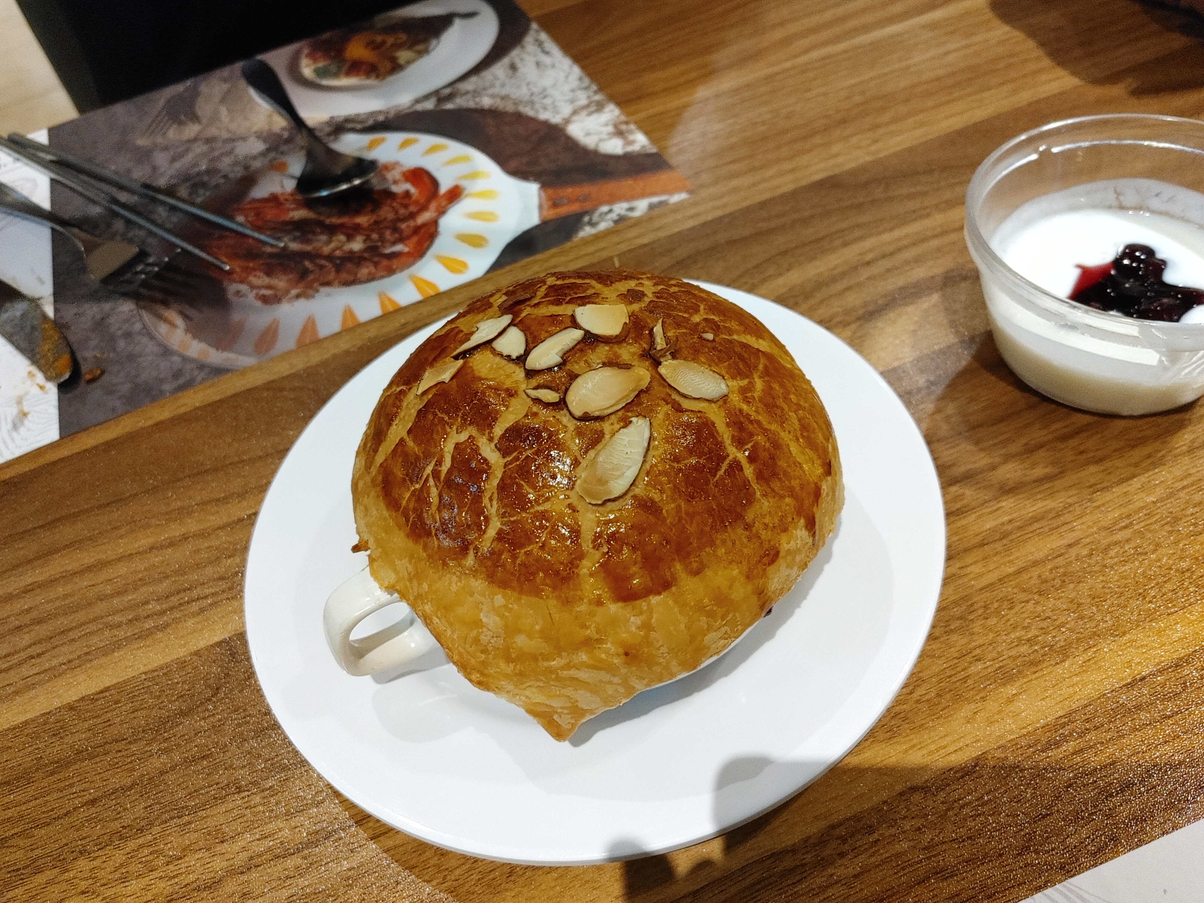 다른 테이블마다 1개씩 다 있길래 우리도 주문해본 파이 도우 수프. 제공시간이 정해져 있었는데 우린 마지막 8시 타임에 받았다. 고소하고 맛있었음.