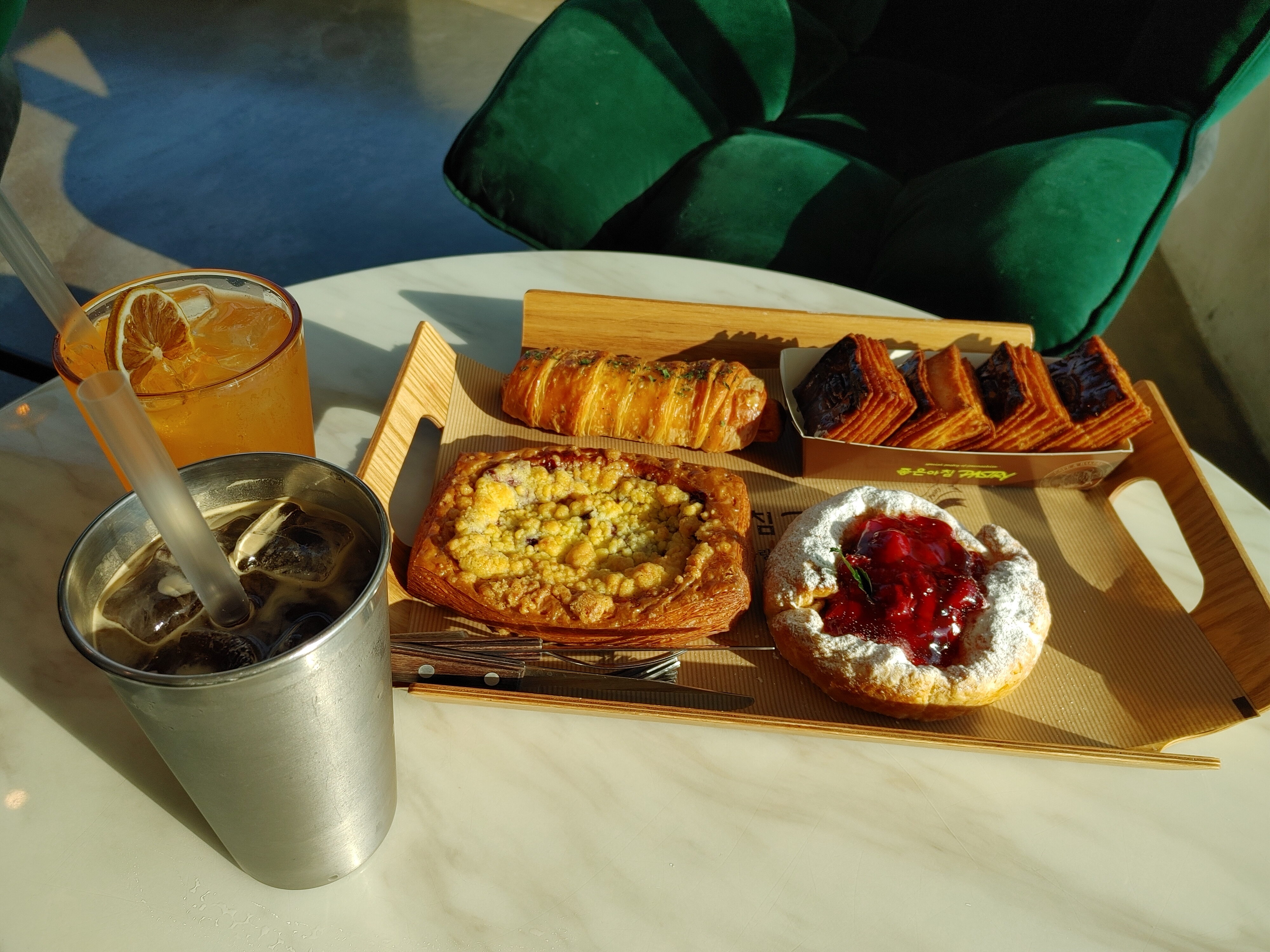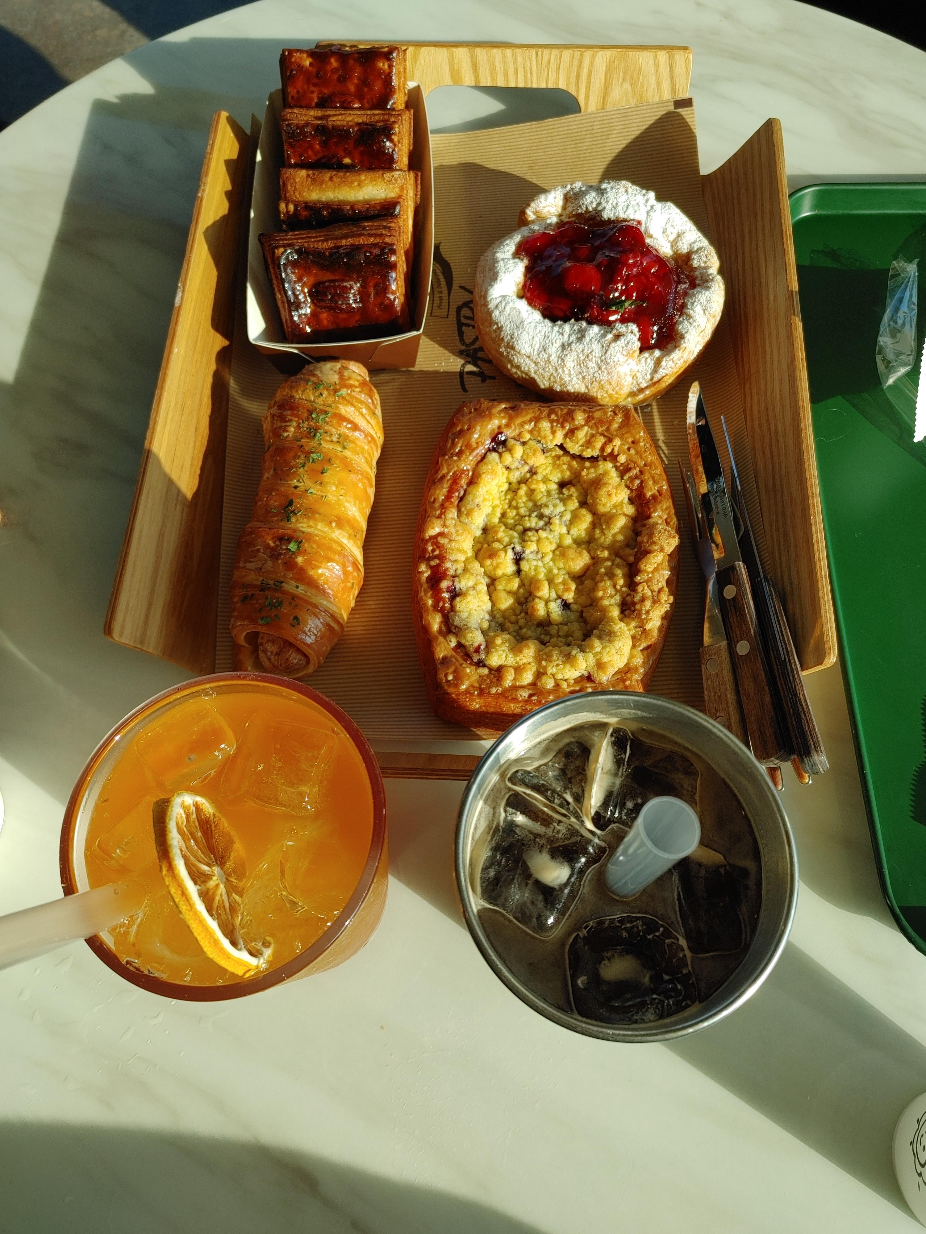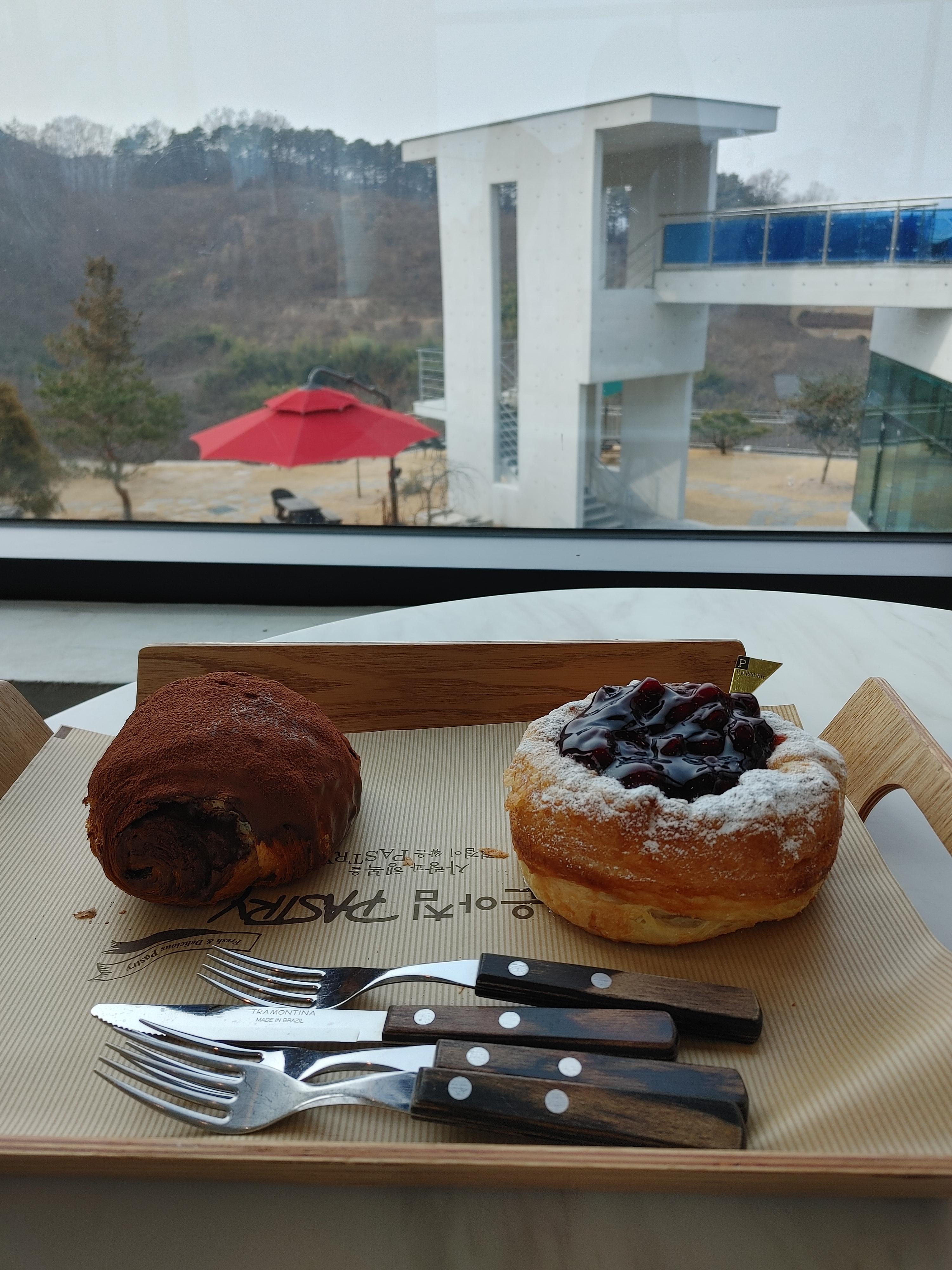 복숭아 에이드와 아이스 아메리카노와 함께 먹었다. 역시 빵에는 커피가 더 잘 어울리는 거 같다. 빵 먹느라 정신없어서 카페 뷰 사진을 못 찍었는데 이곳 전망도 진짜 좋다. 홍성 내포 데이트하기 좋은 카페로 추천한다. 🥐☕