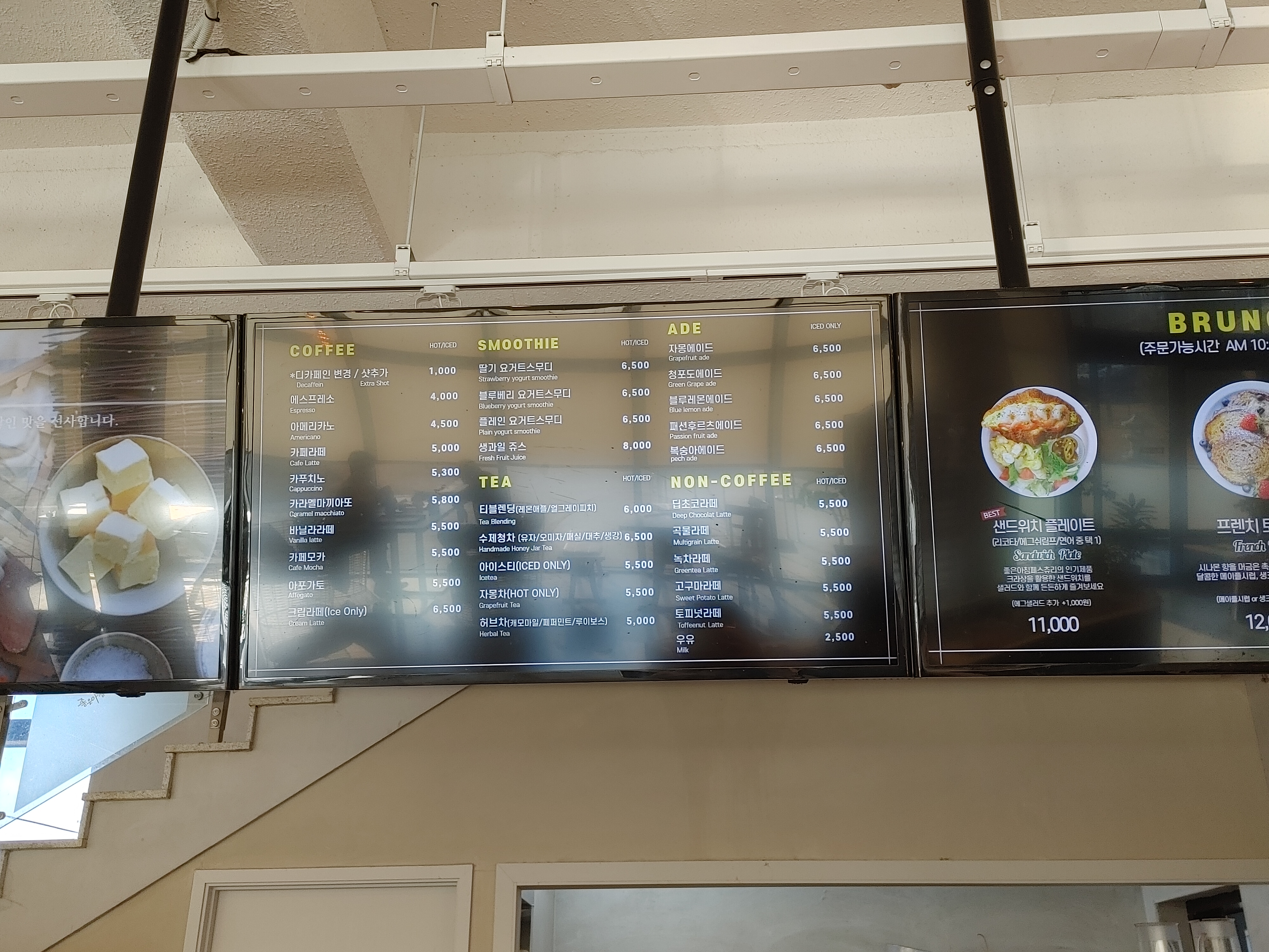 음료는 커피, 스무디, 티, 에이드, 라떼 종류가 있다. 오전 10시 ~ 오후 3시에는 브런치 메뉴도 가능하다.