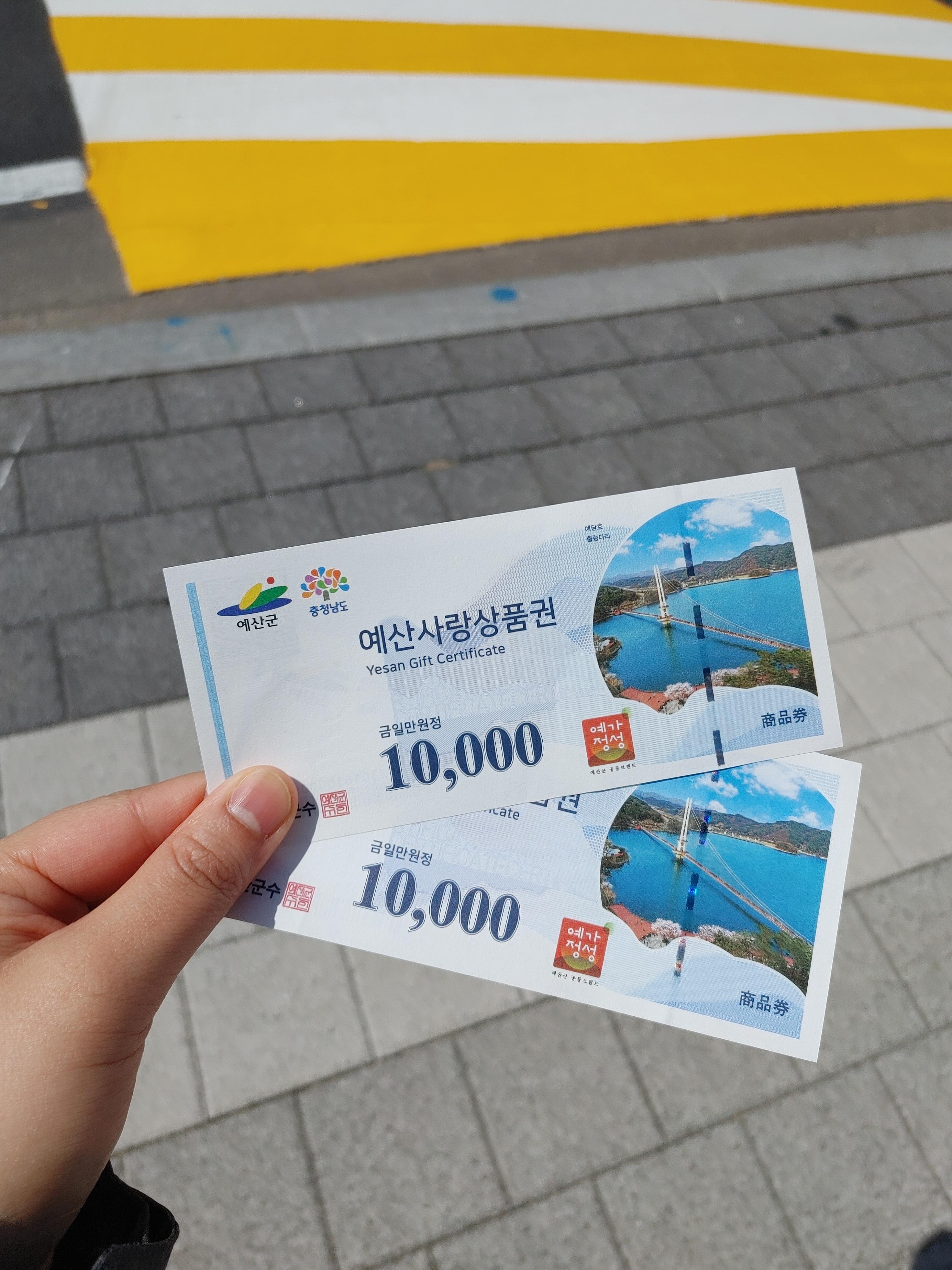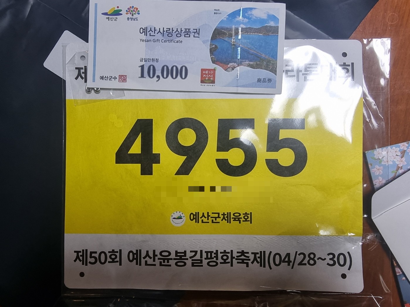 예산마라톤 홈페이지에서 참가 신청을 미리 했다. 대회 1주일 전에 배번호표랑 예산사랑상품권(지역상품권)을 택배로 받았다. 참가비가 15,000원밖에 안 하는데 지역상품권을 1만 원이나 준다니 개이득이었다. 그리고 쓸데없는 기념티 대신 지역상품권으로 줘서 더 좋았다. 기념티는 마라톤대회 당일 딱 한 번 입고 옷장에 박아두게 되곤 했었다. 암튼 원하는 걸 구입할 수 있는 지역상품권으로 받아서 정말 좋았다.