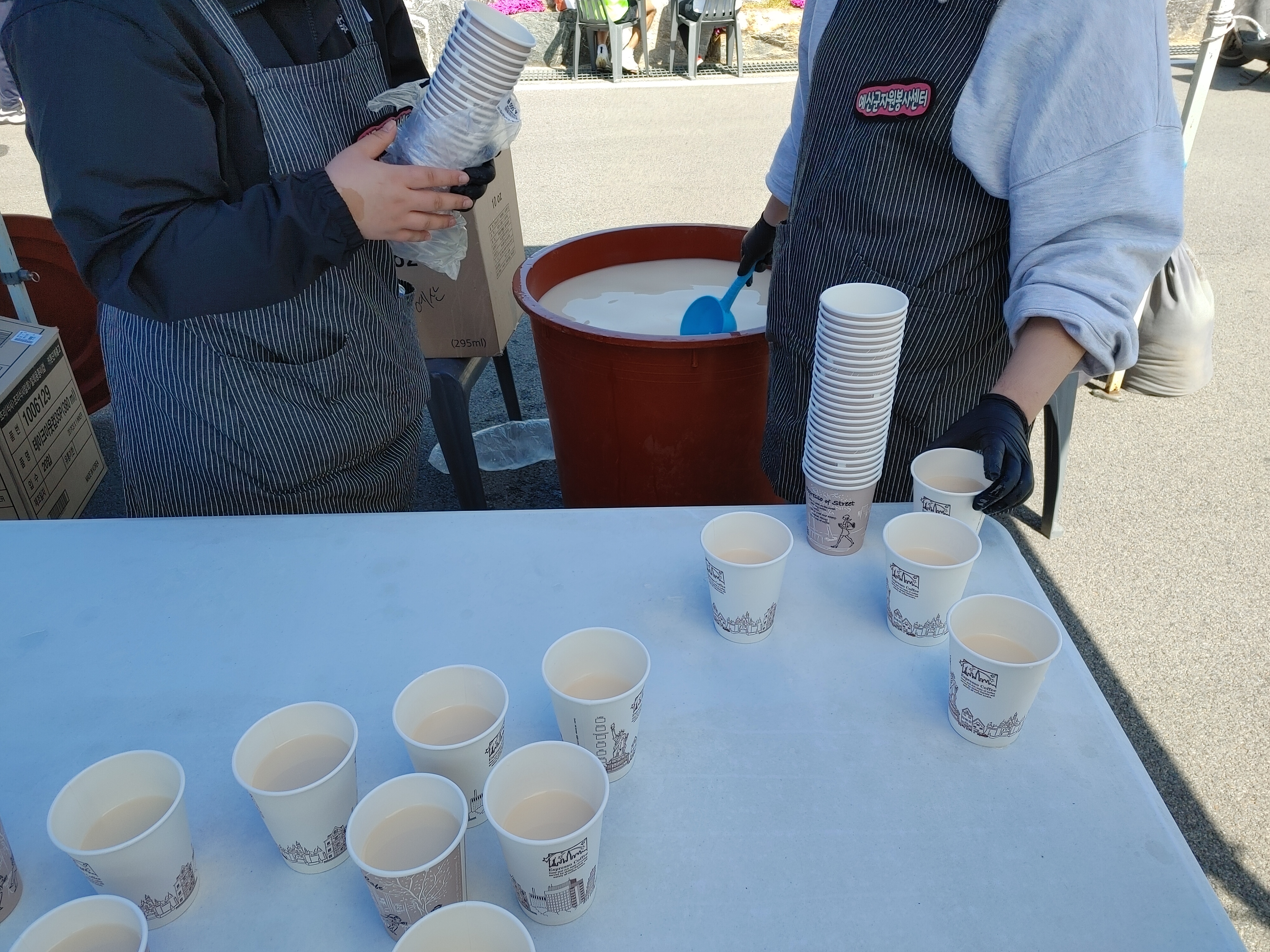 예산 지역 막걸리도 주고, 방울토마토 및 식혜 같은 것도 있었다. 시식하는 곳 근처에 지역 상품 홍보하러 오신 분들이 계셔서 볼거리도 많았다.