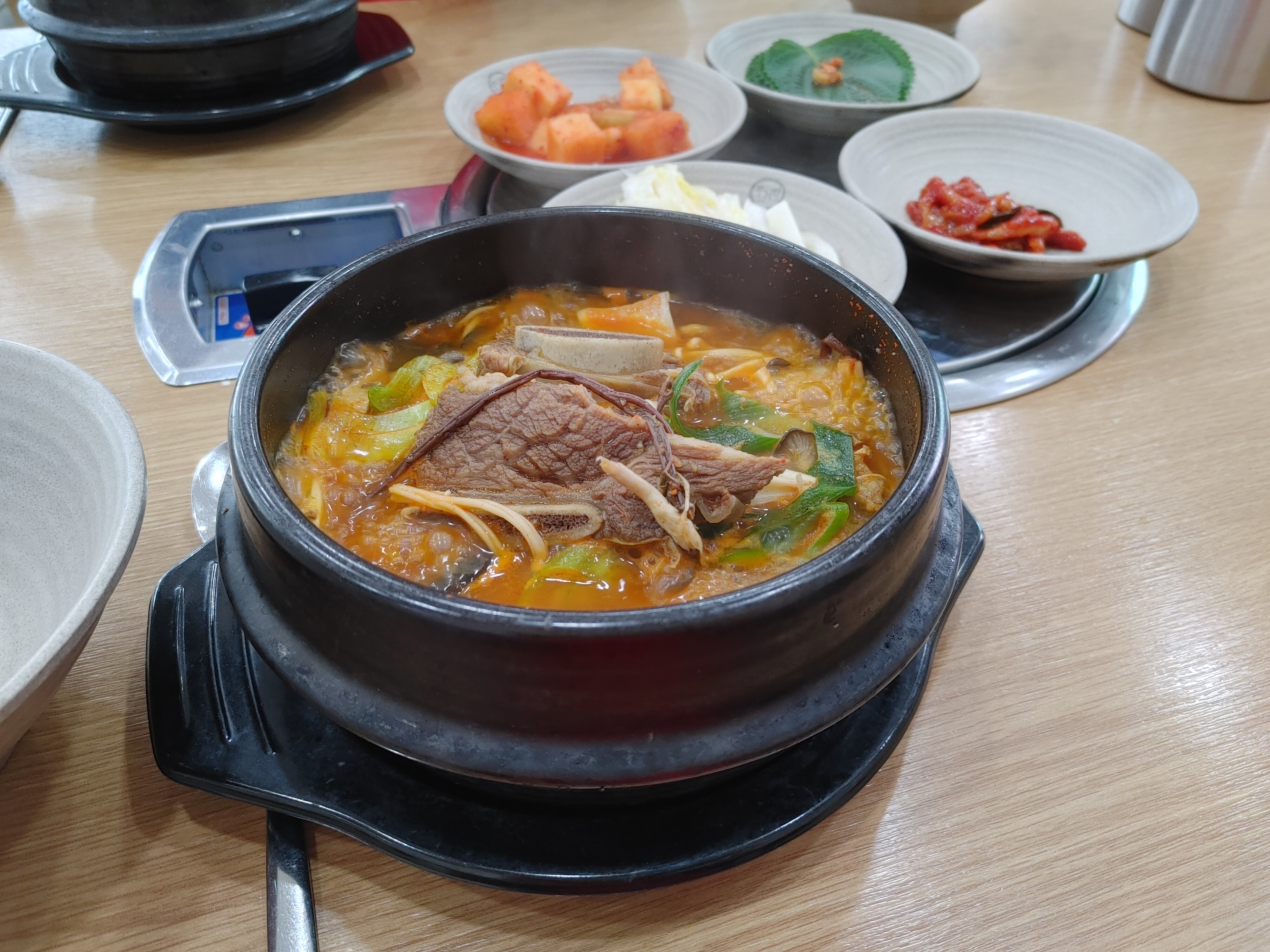두거리우신탕은 갈비대가 붙은 큼지막한 소고기가 많이 들어 있어서 좋았다. 고사리, 파, 버섯 등 각종 건더기가 많았다. 매콤한 정도도 딱 좋았다. 맵찔이인 나도 맛있게 먹을 수 있었다.