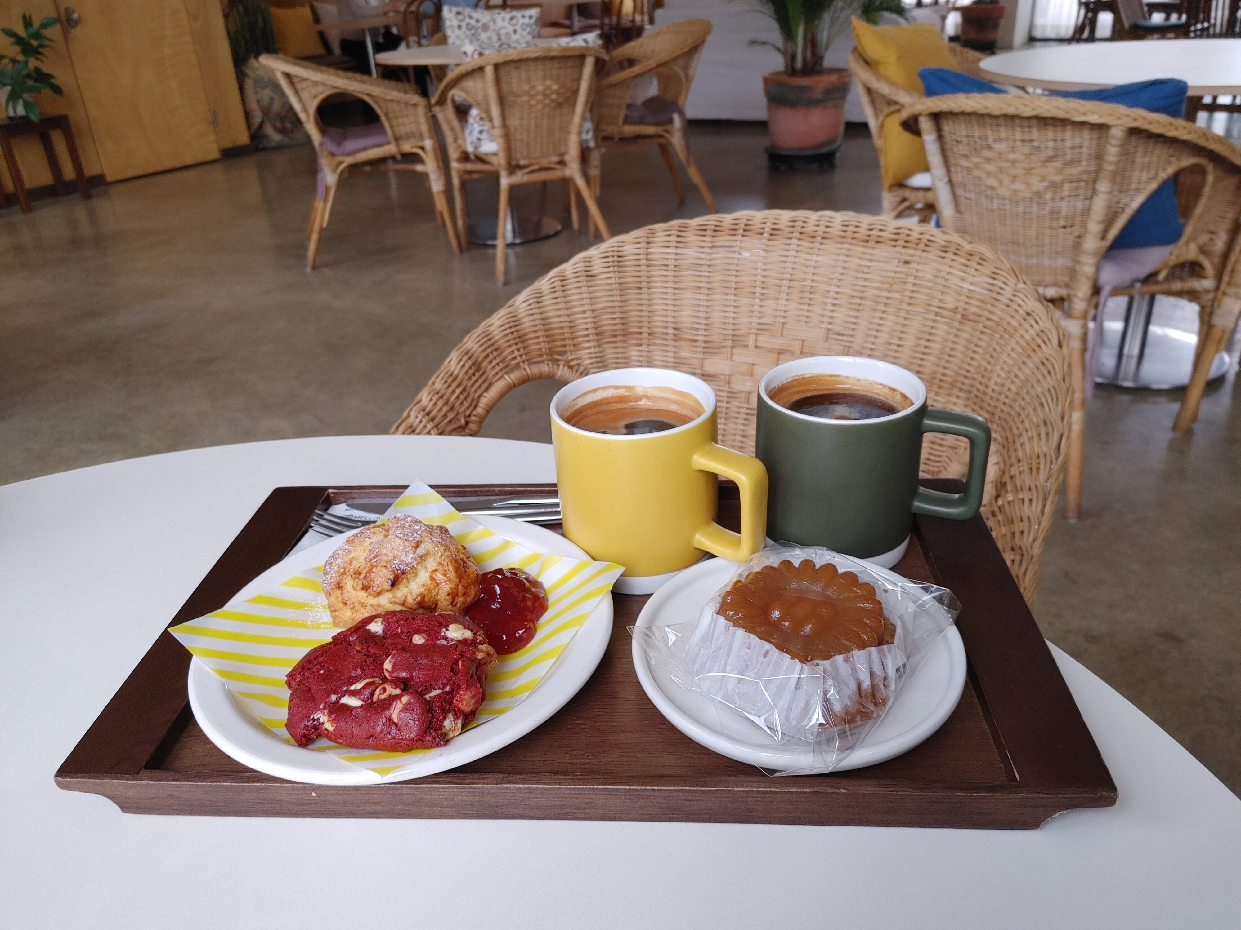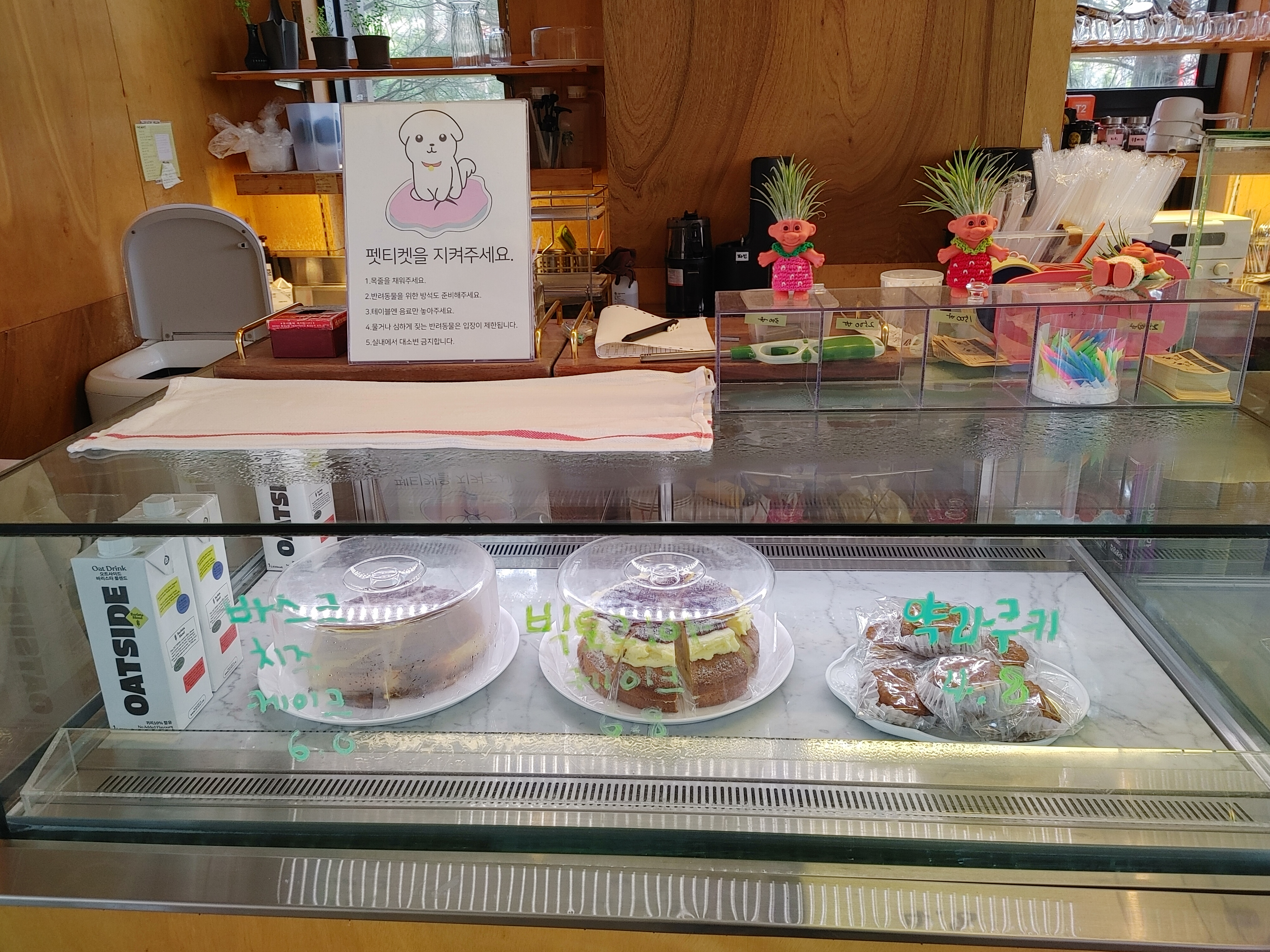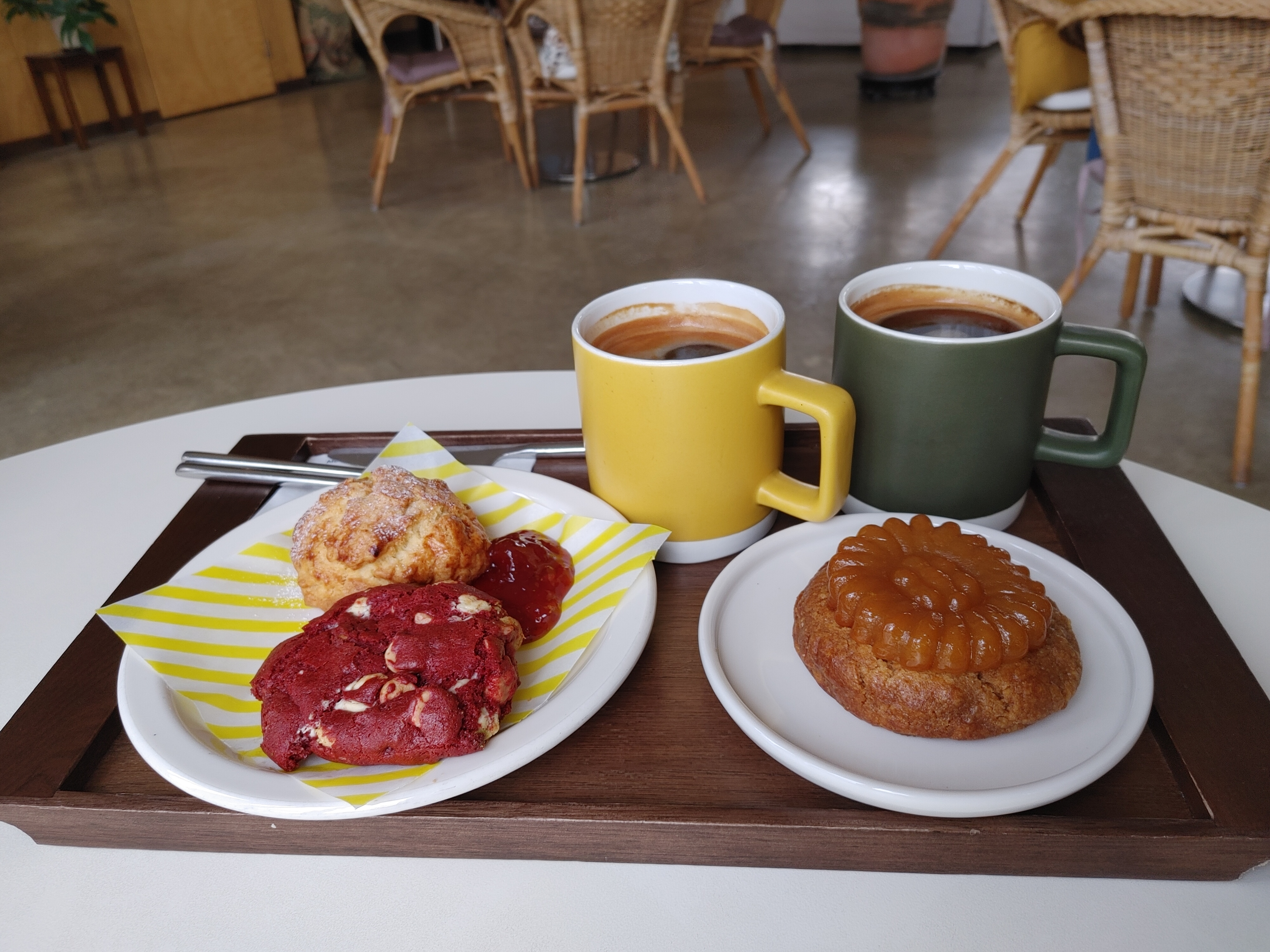 가격은 따뜻한 아메리카노 4,500원, 약과 쿠키 4,800원, 플레인 스콘과 딸기잼, 레드벨벳 쿠키는 각각 3,500원이었다.