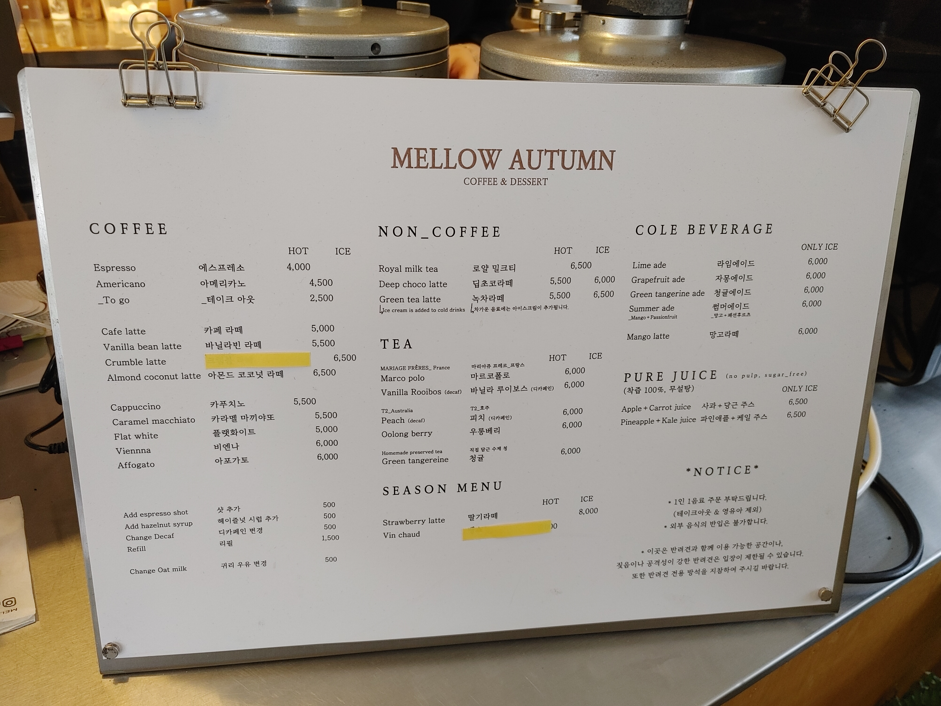 멜로우어텀 메뉴판. 음료는 커피, 티, 시즌 메뉴, 과일주스, 라떼, 에이드 등이 있었다.