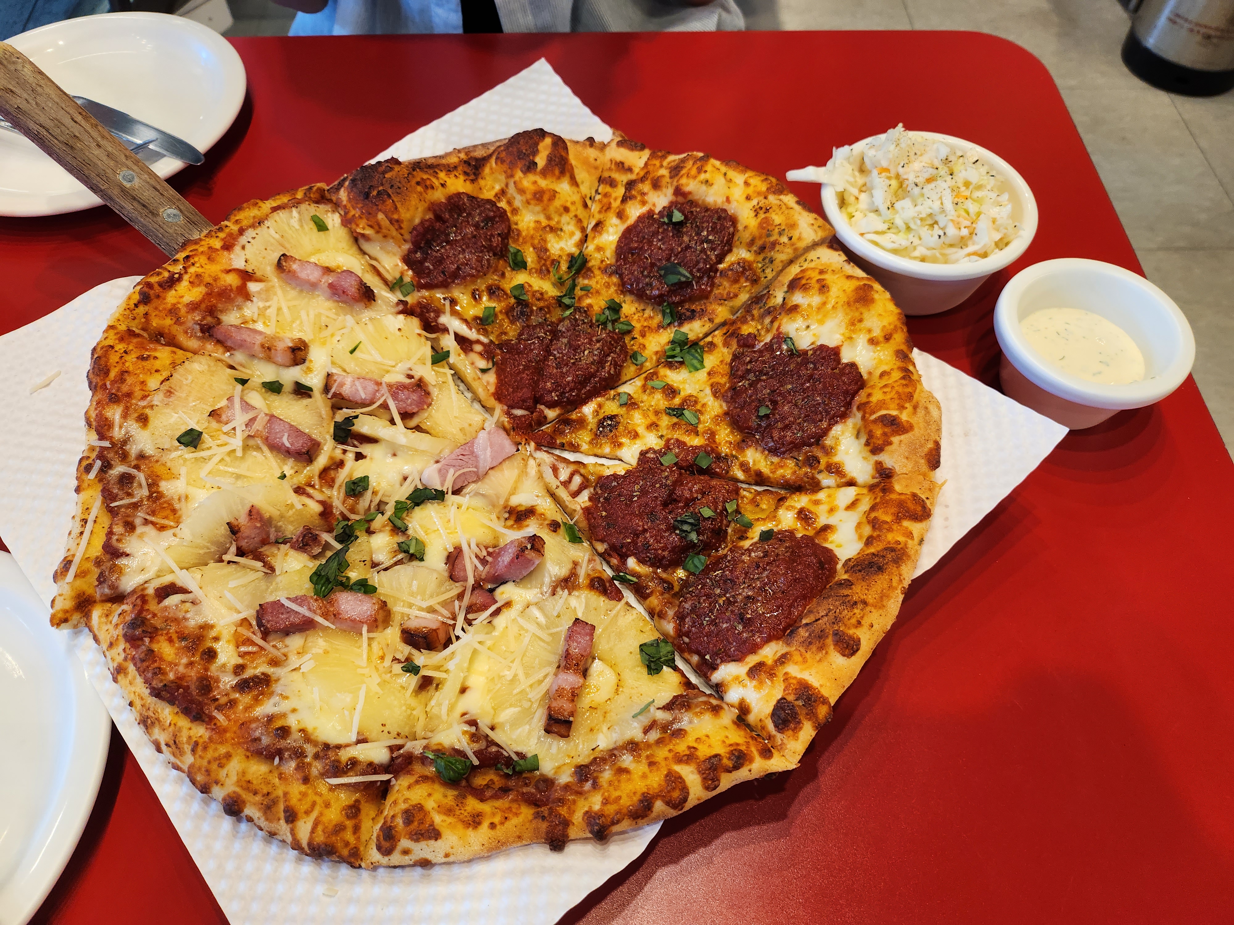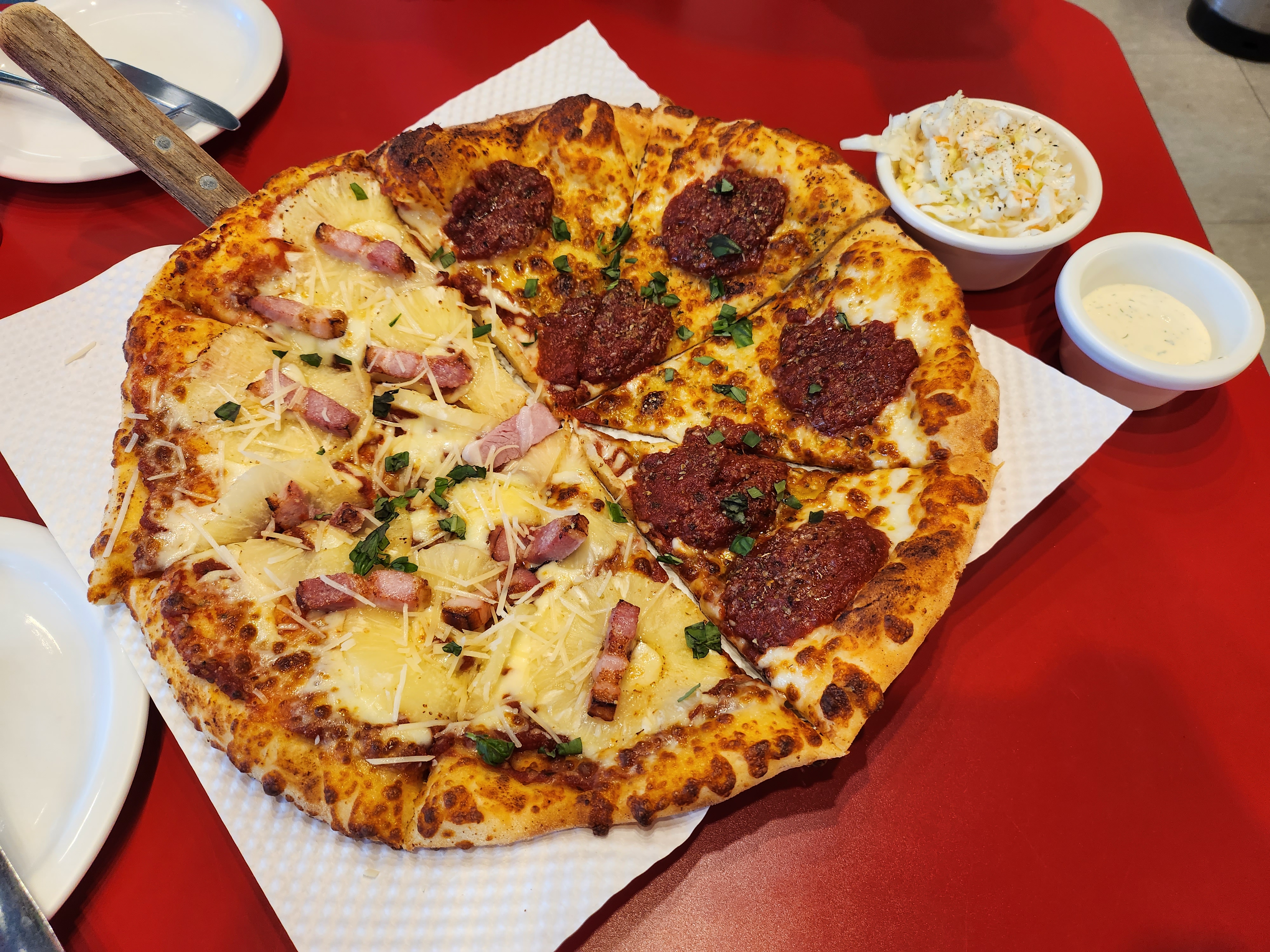 그리고 하와이안 피자는 마가리타 피자에 두꺼운 베이컨과 파인애플이 잔뜩 올라간 피자였다. 하와이안 피자에 대한 호불호가 갈리지만 나는 원래 좋아하는 사람이어서 파인애플이 잔뜩 올라 가 있는 잭슨표 하와이안 피자가 매우 좋았다. 베이컨도 정말 맛있었다. 메뉴판 사진보다 토핑이 훨씬 더 많이 올라 간 듯. 잭슨피자 이촌점에서 맛있고 기분좋은 식사를 하고 왔다. 너무 맛있어서 다음에 또 방문해야겠다. 완전 추천추천 ~! 🍕🥓🥤