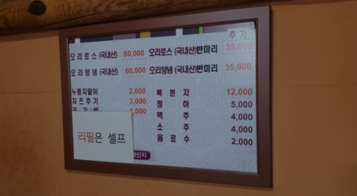 청양 흙사랑 오리로스는 한 마리 기준 60,000원이다. 오리로스는 양념 없이 하얗게 구워먹는 거고 오리양념은 빨간 양념이다.