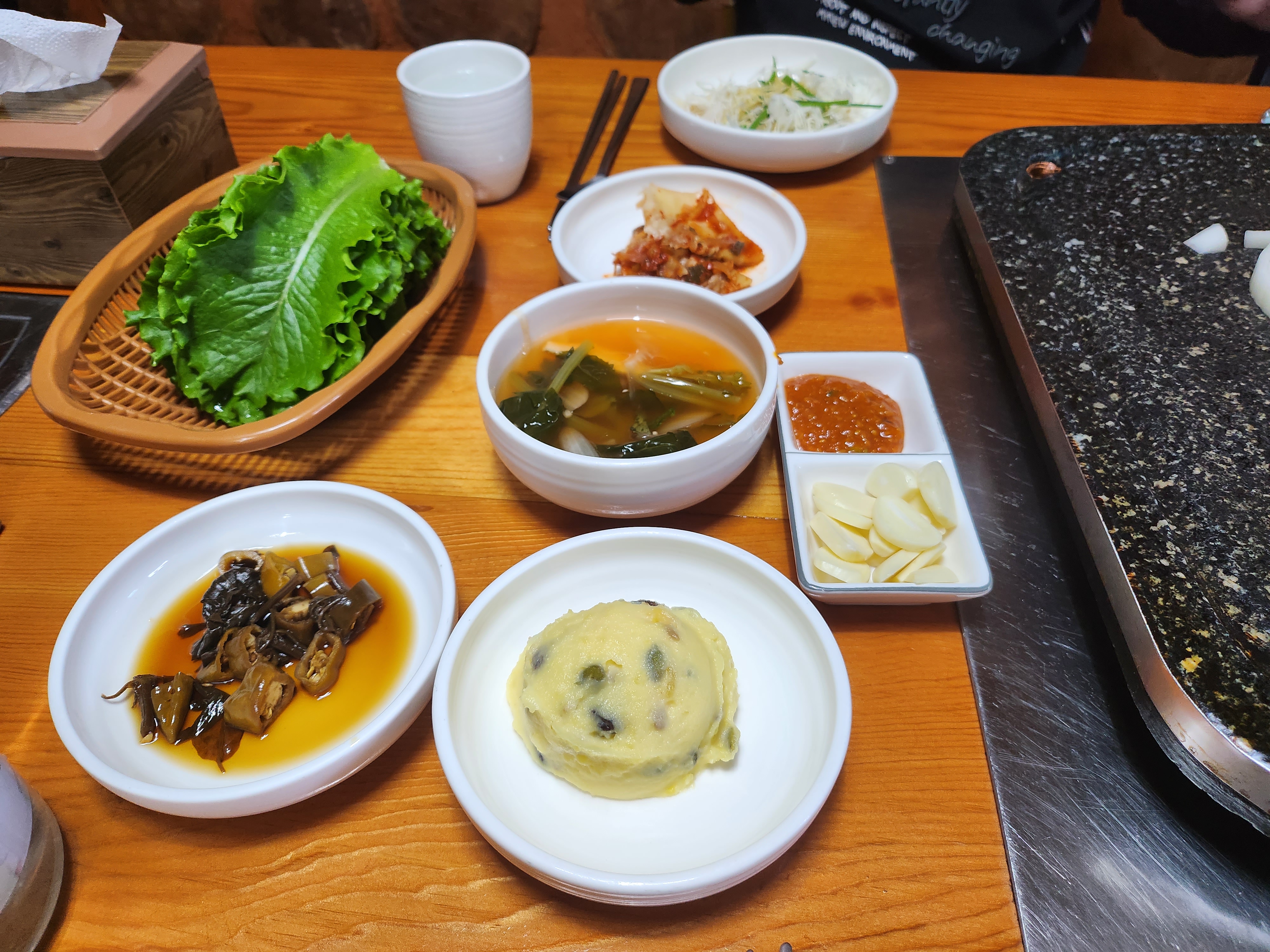 청양 흙사랑 기본 반찬이다. 오이장아찌, 물김치, 배추김치, 상추, 고구마무스, 생마늘, 양파절임이 나온다. 사장님께 고추 있냐고 여쭤봤더니 청양 고추를 가져다주셨는데 엄청나게 매웠다.