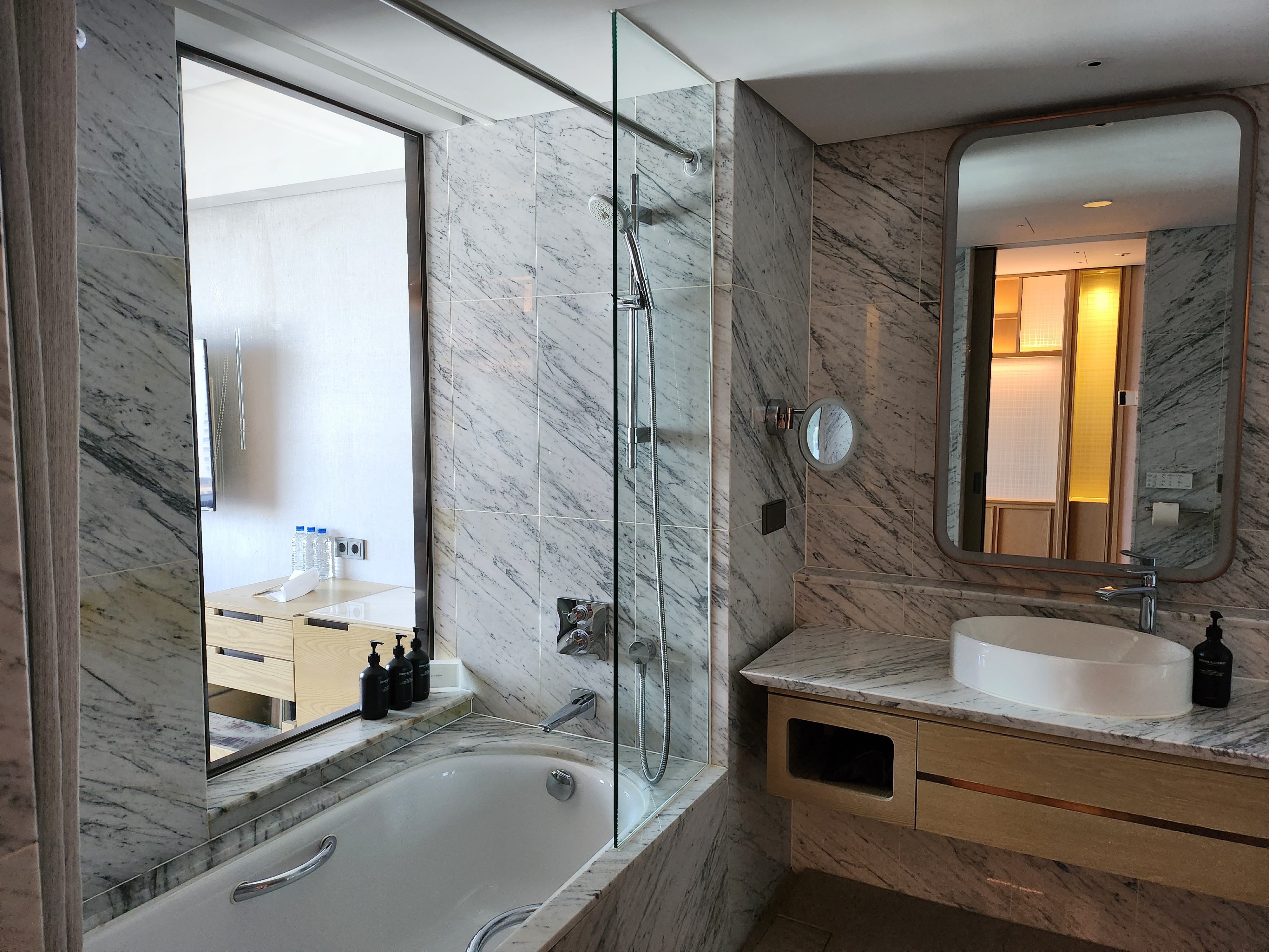 화장실에는 욕조도 있었다. 깔끔하고 넓었다. 나는 사우나를 다녀와서 객실 욕조는 따로 사용하지는 않았다. 2인까지 사우나가 무료였다. (현재는 유료로 변경됨.) 어매니티 중에 칫솔, 치약은 없어서 외부 편의점에서 따로 구입했다.
