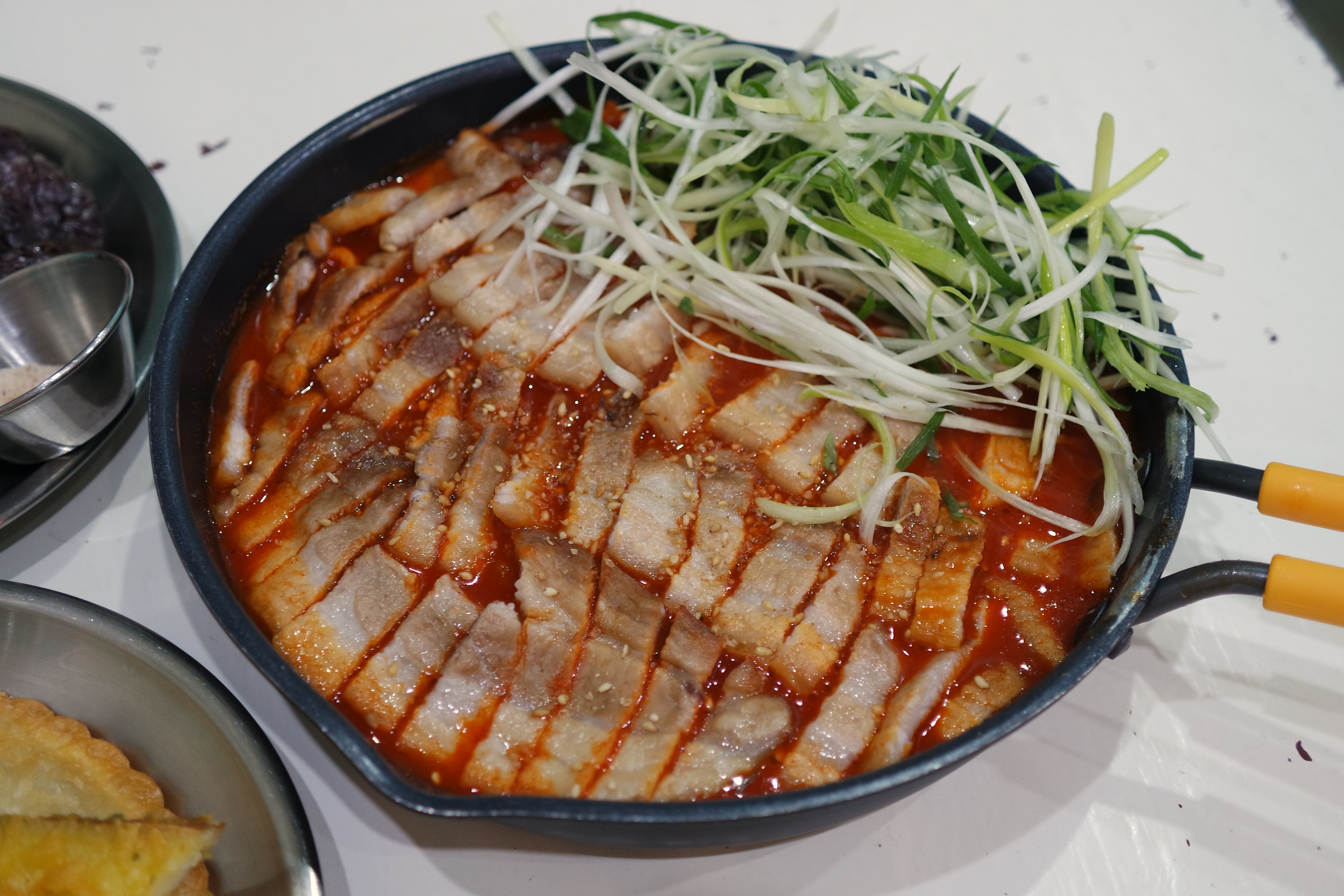 떡볶이 위에 빈틈없이 채워진 삼겹살 구이, 그리고 그 위에 파채가 올라가 있었다.