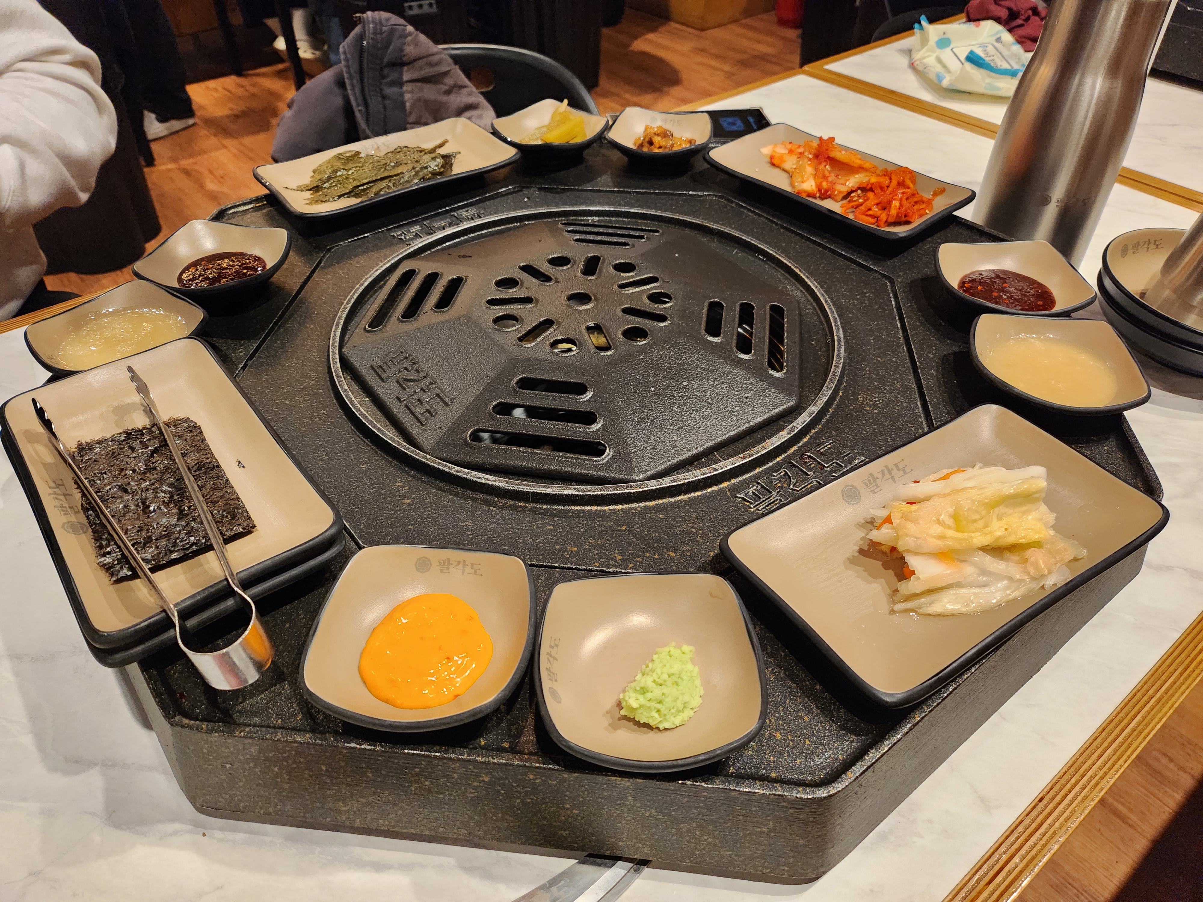 팔각도 기본 상차림이다. 불판 옆에 각종 소스와 김치, 단무지, 와사비, 김, 깻잎절임 등이 세팅되었다. 우리는 일단 숯불닭갈비 2인분을 주문했다.