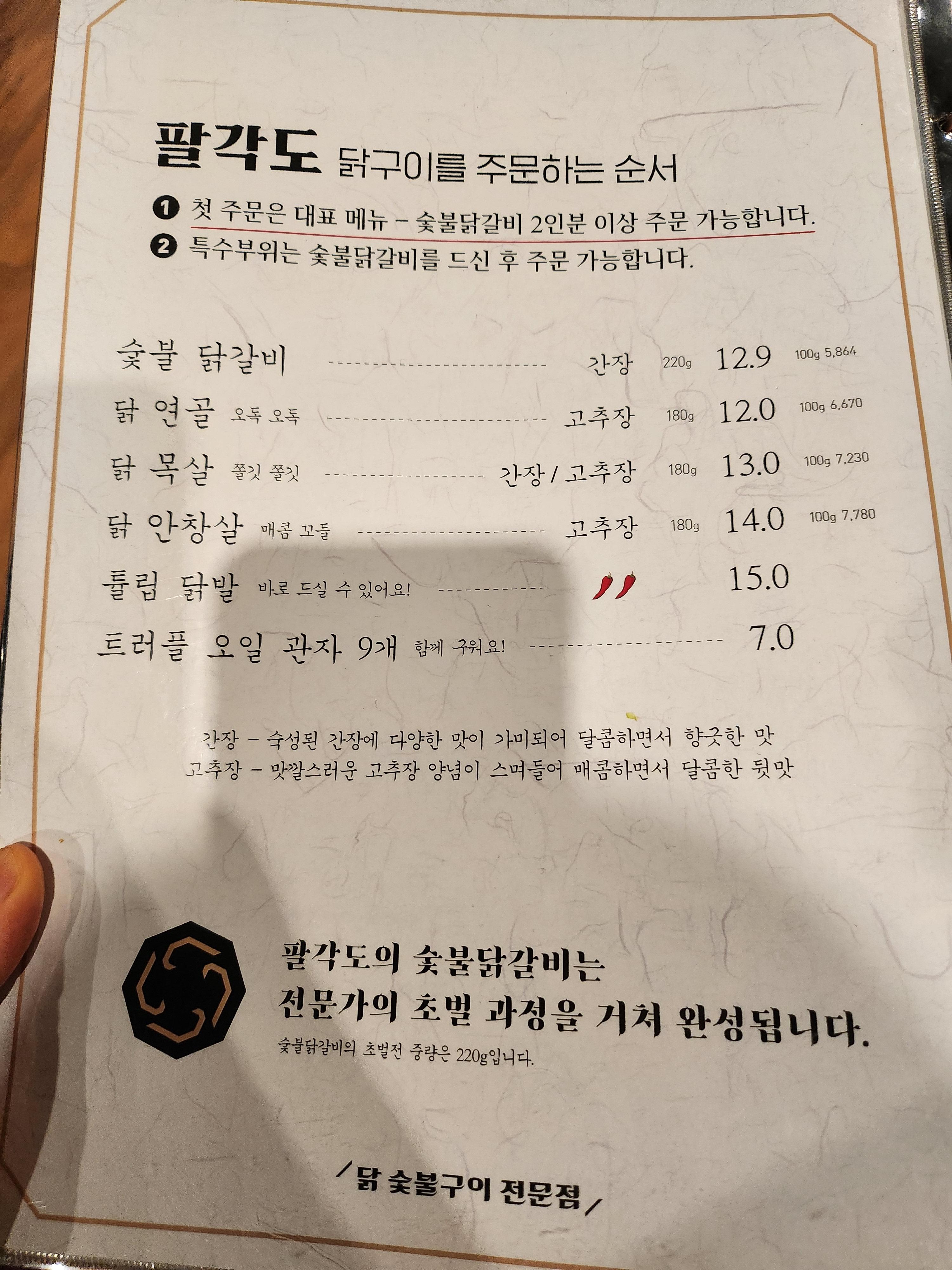 팔각도 메뉴판이다. 팔각도 닭구이는 첫 주문은 대표 메뉴인 '숯불 닭갈비'부터 주문해야 한다. 숯불닭갈비를 먹은 후 다른 구이 메뉴 주문 가능하다는 점이 특이했다.