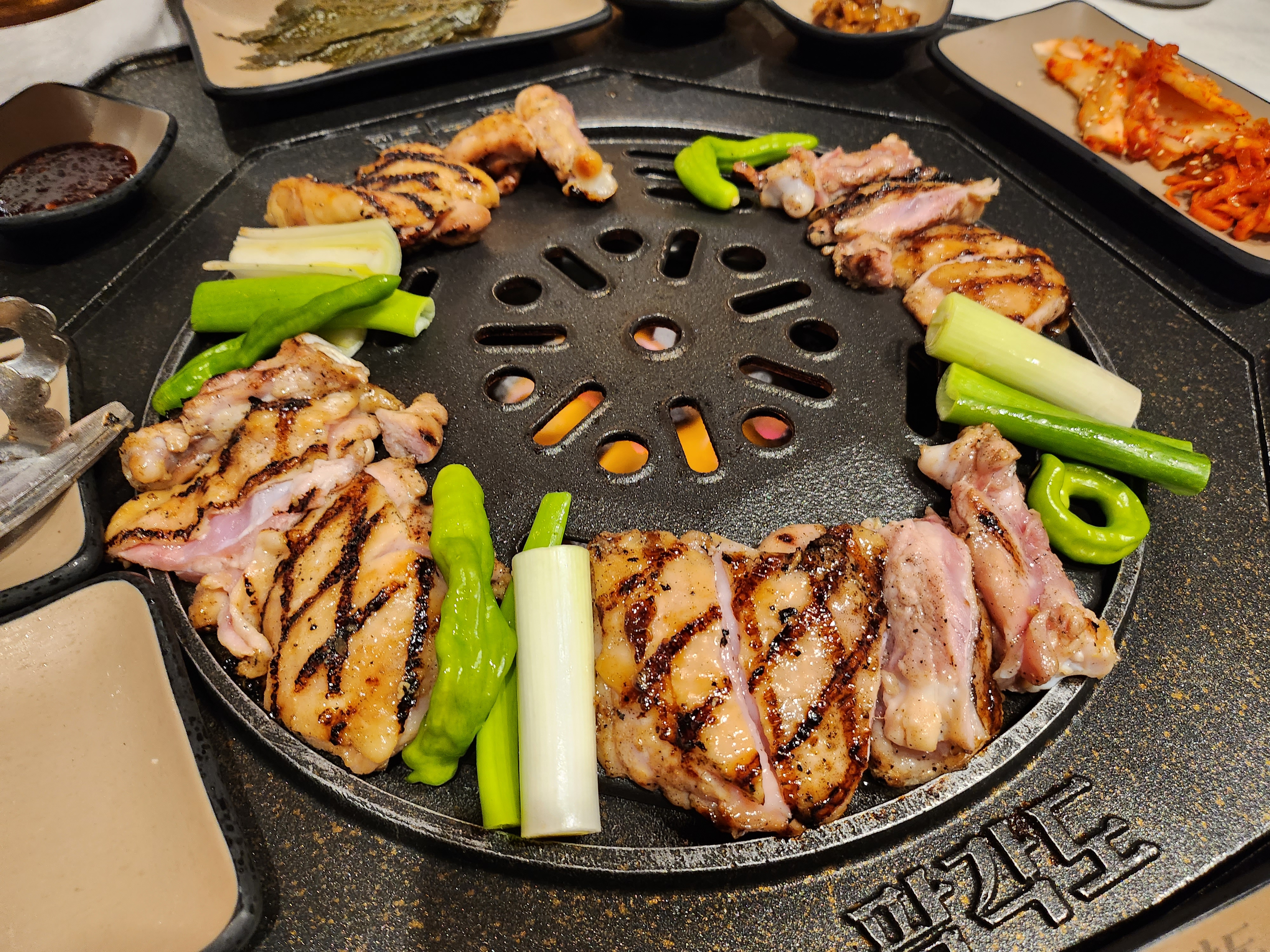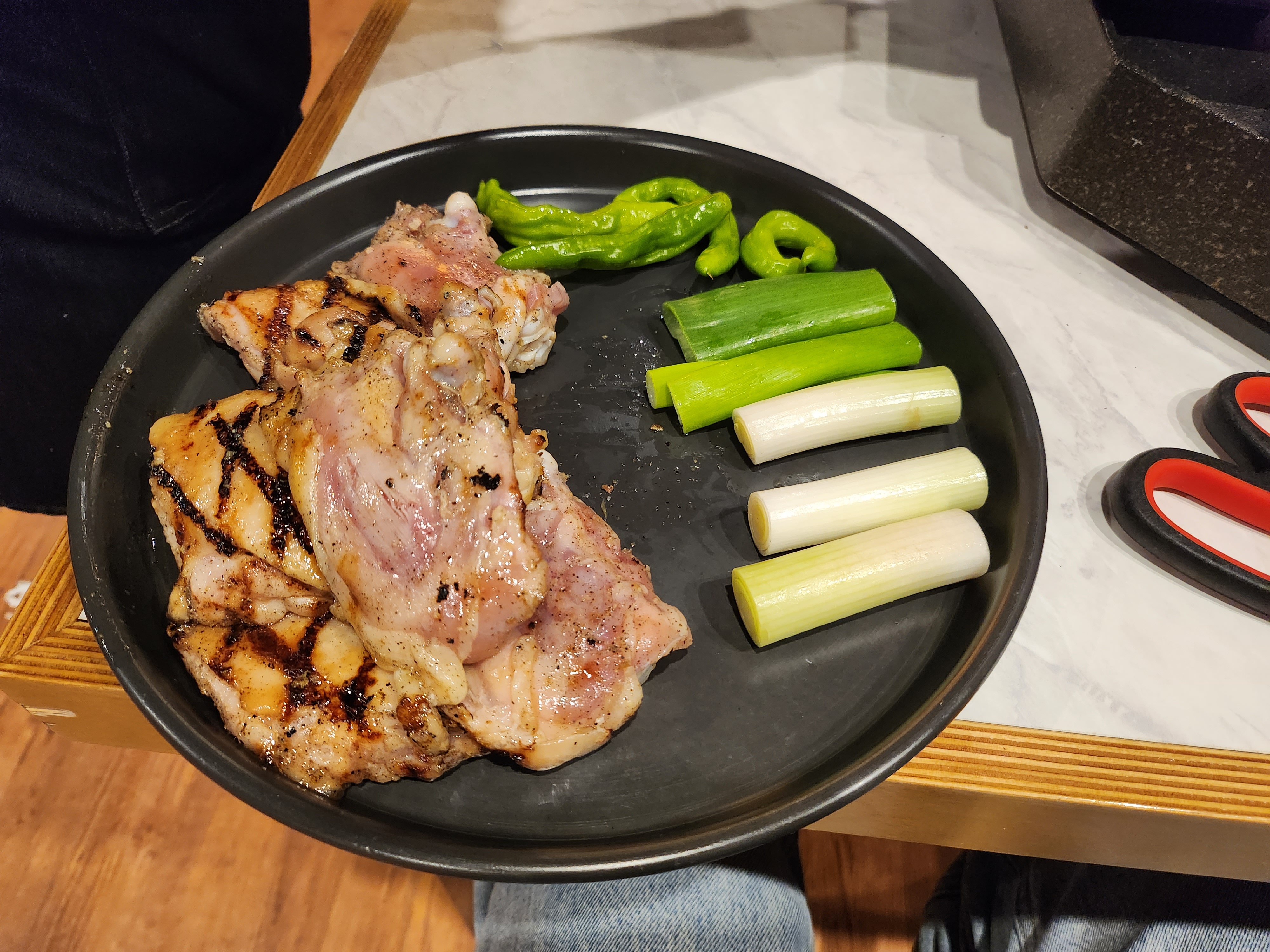 숯불이라 불조절이 안됐지만 닭갈비 맛은 좋았다. 고기 엄청 부드럽고 고급스러운 맛이었다. 파구이도 같이 먹으면 찰떡궁합이다. 다양한 소스를 찍어먹는 재미도 있었다. 순식간에 숯불 닭갈비를 해치우고 식사를 시켰다.