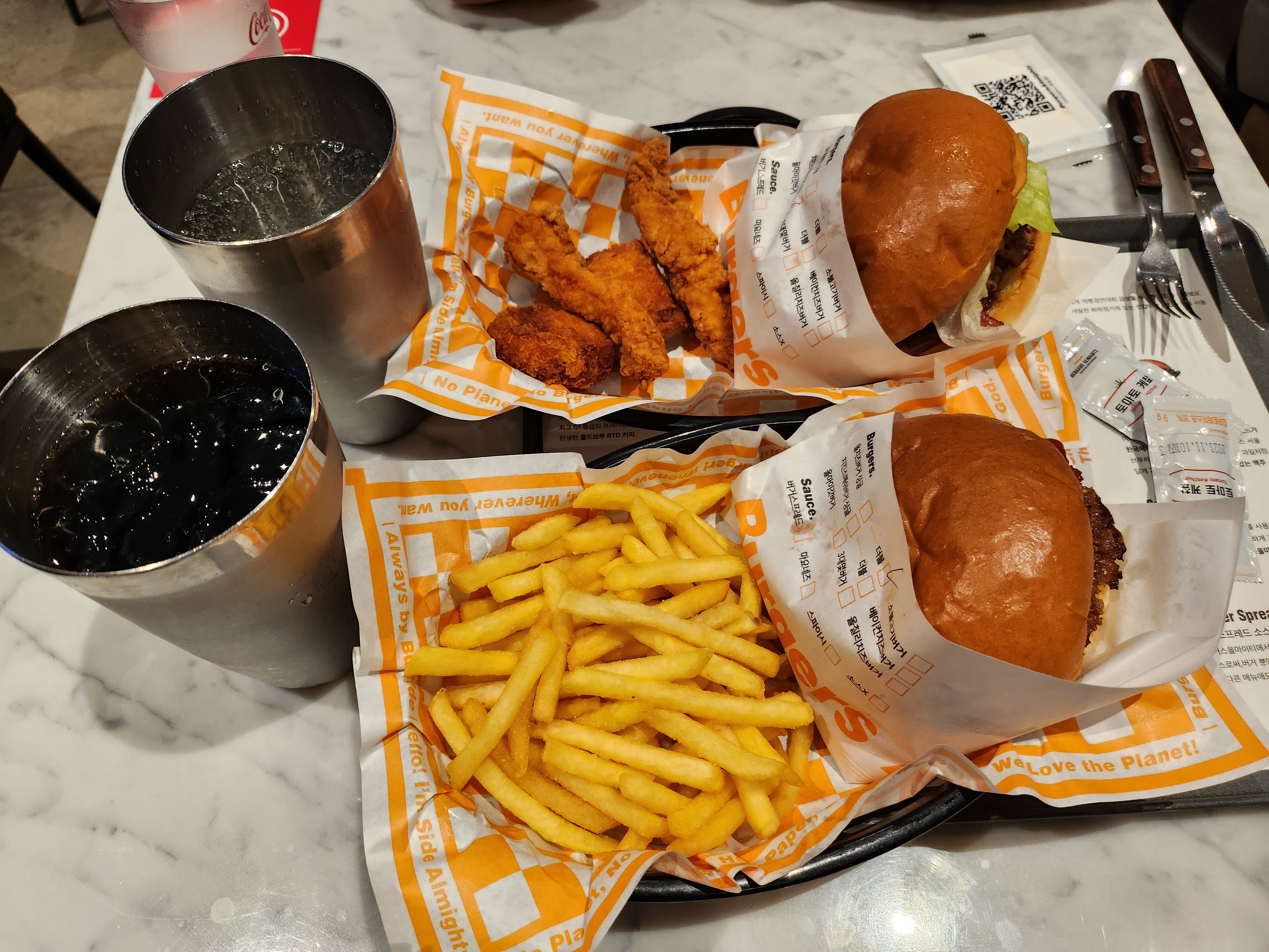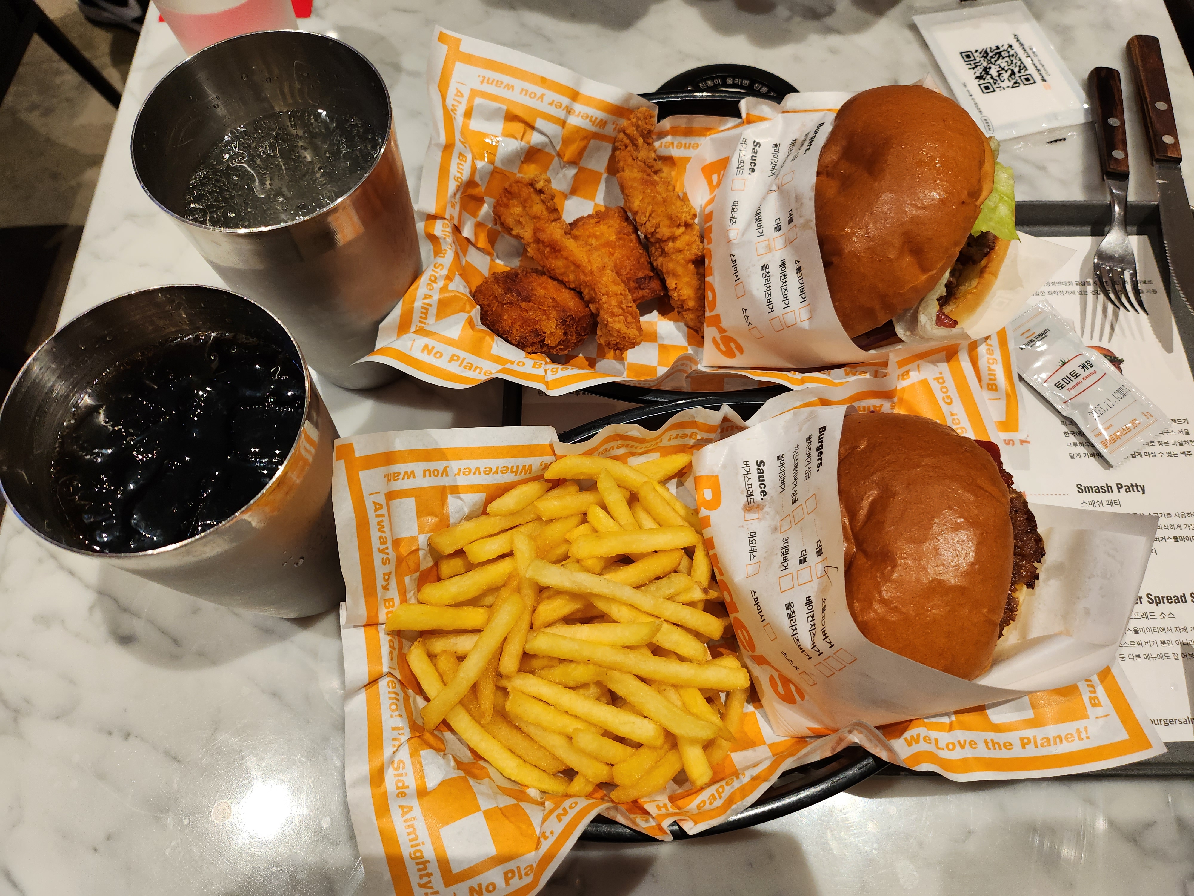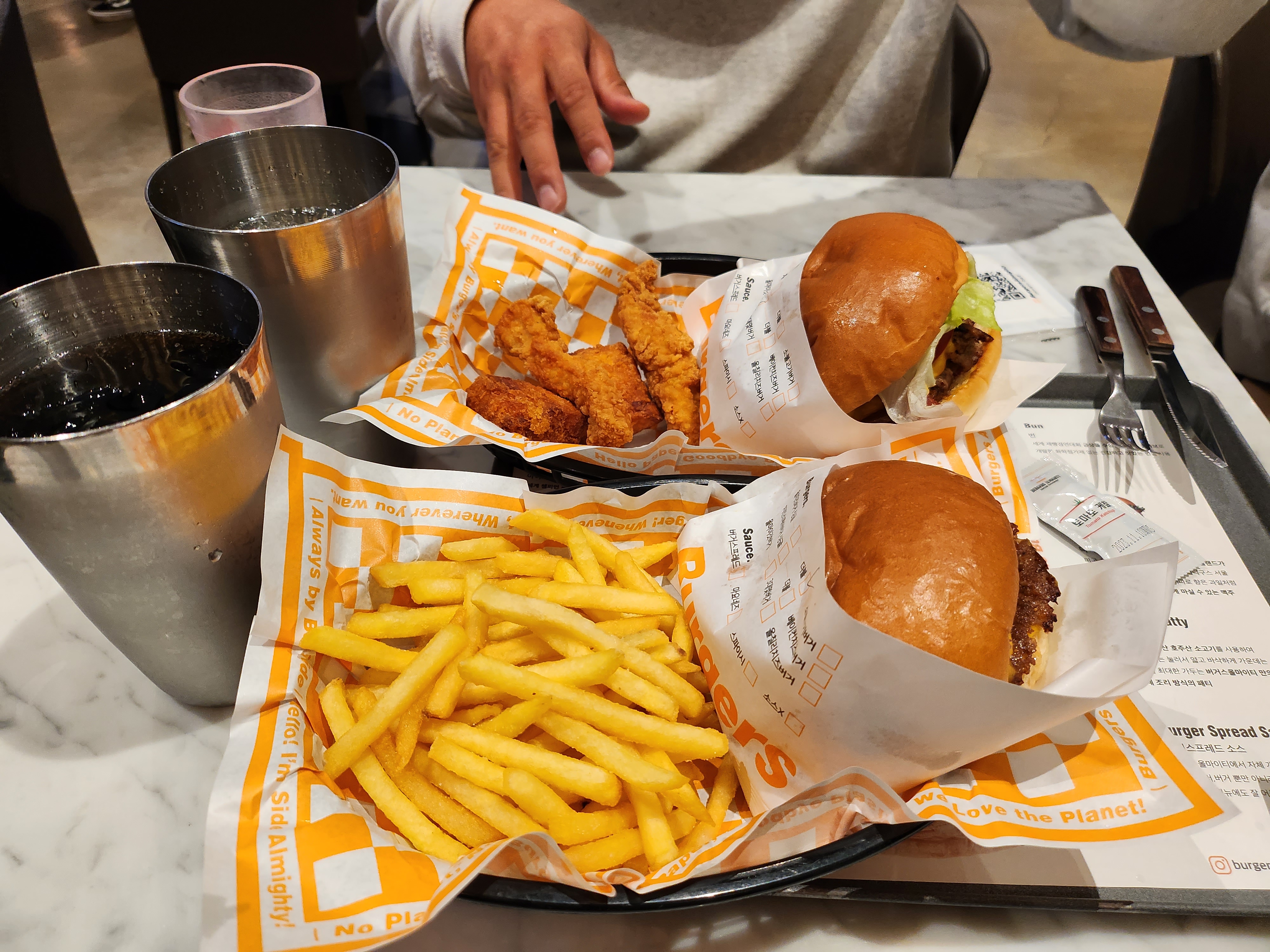 우리는 올치즈버거(더블패티) 세트와 올마이갓버거 단품, 탄산음료를 주문했다.