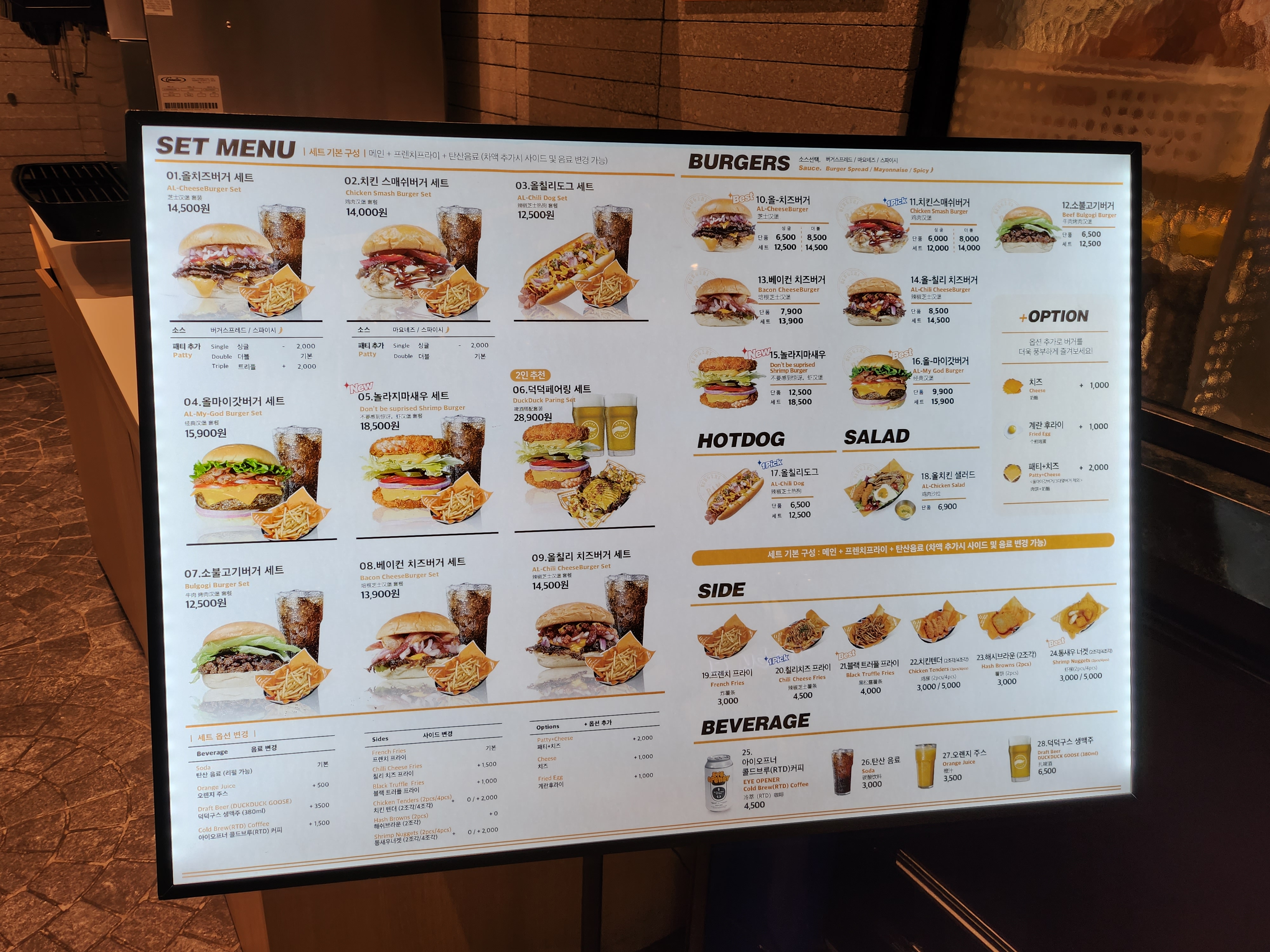 버거스올마이티 메뉴판이다. 각종 버거와 핫도그, 샐러드, 사이드 메뉴 등이 있다. 역시 햄버거는 세트로 먹어야 진리!