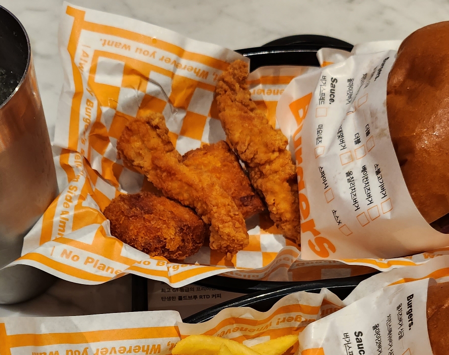 이 버거는 올마이갓버거이다. 단품가격은 9,900원이다. 양상추, 토마토, 치즈, 베이컨, 양파, 치즈, 패티가 들어가 있다. 베스트 메뉴답게 정말 맛있었다. 이 메뉴를 단품으로 시킨 이유는 네이버에서 제공하는 치킨 텐더 2조각 무료 쿠폰이 있었기 때문이다.