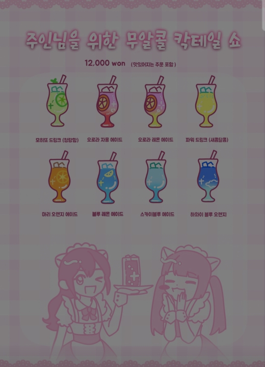 이건 메이드문 칵테일 메뉴판이다. 가격은 12,000원이고 맛있어지는 주문이 포함된 가격이다.