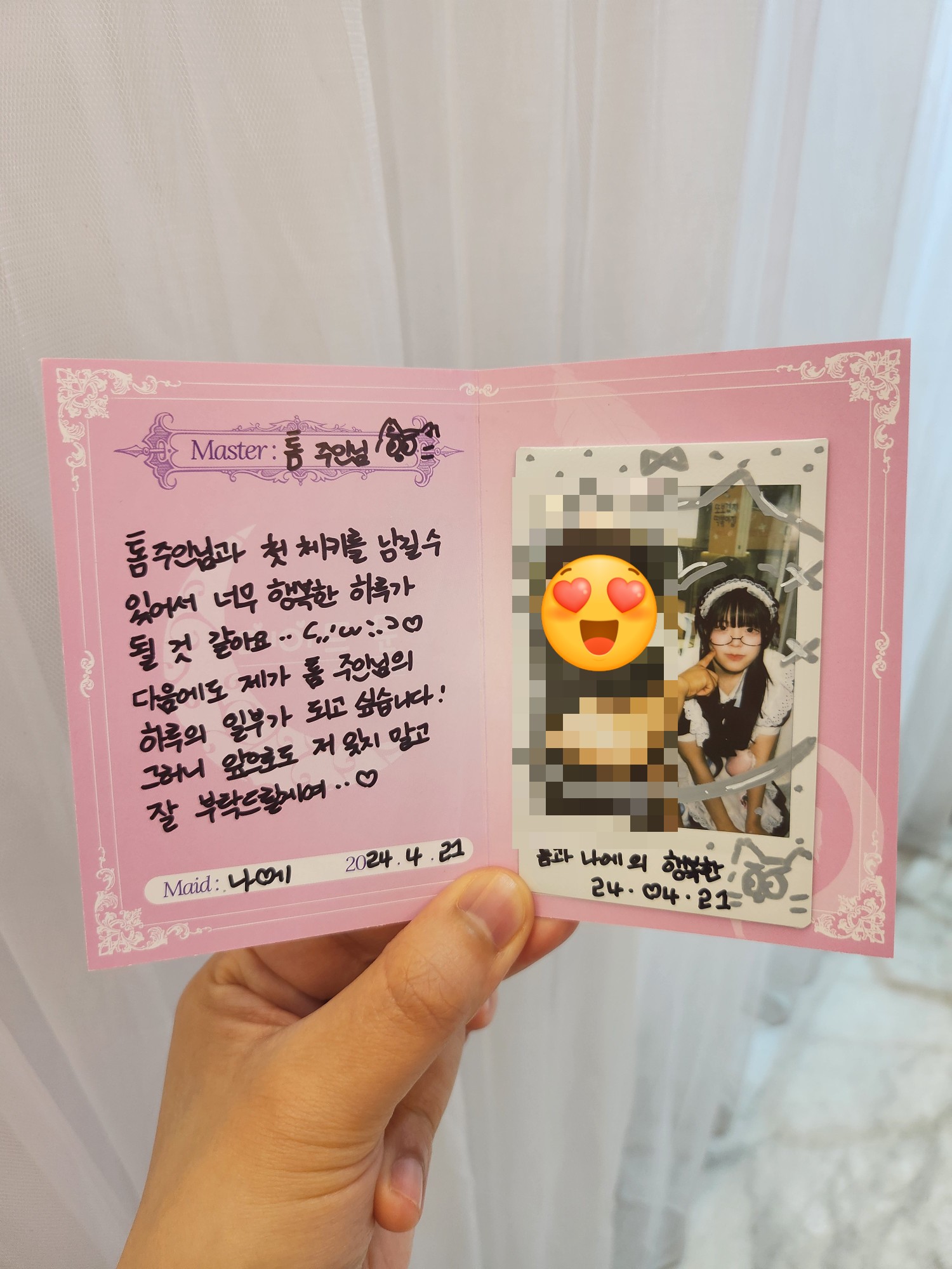 내가 오자고 했지만 남자친구가 참 좋아하는 것 같아서 이왕 온 김에 체키포토도 하라고 권했다. 체키포토는 메이드님과 폴라로이드 사진 촬영을 할 수 있고 편지도 써주신다.