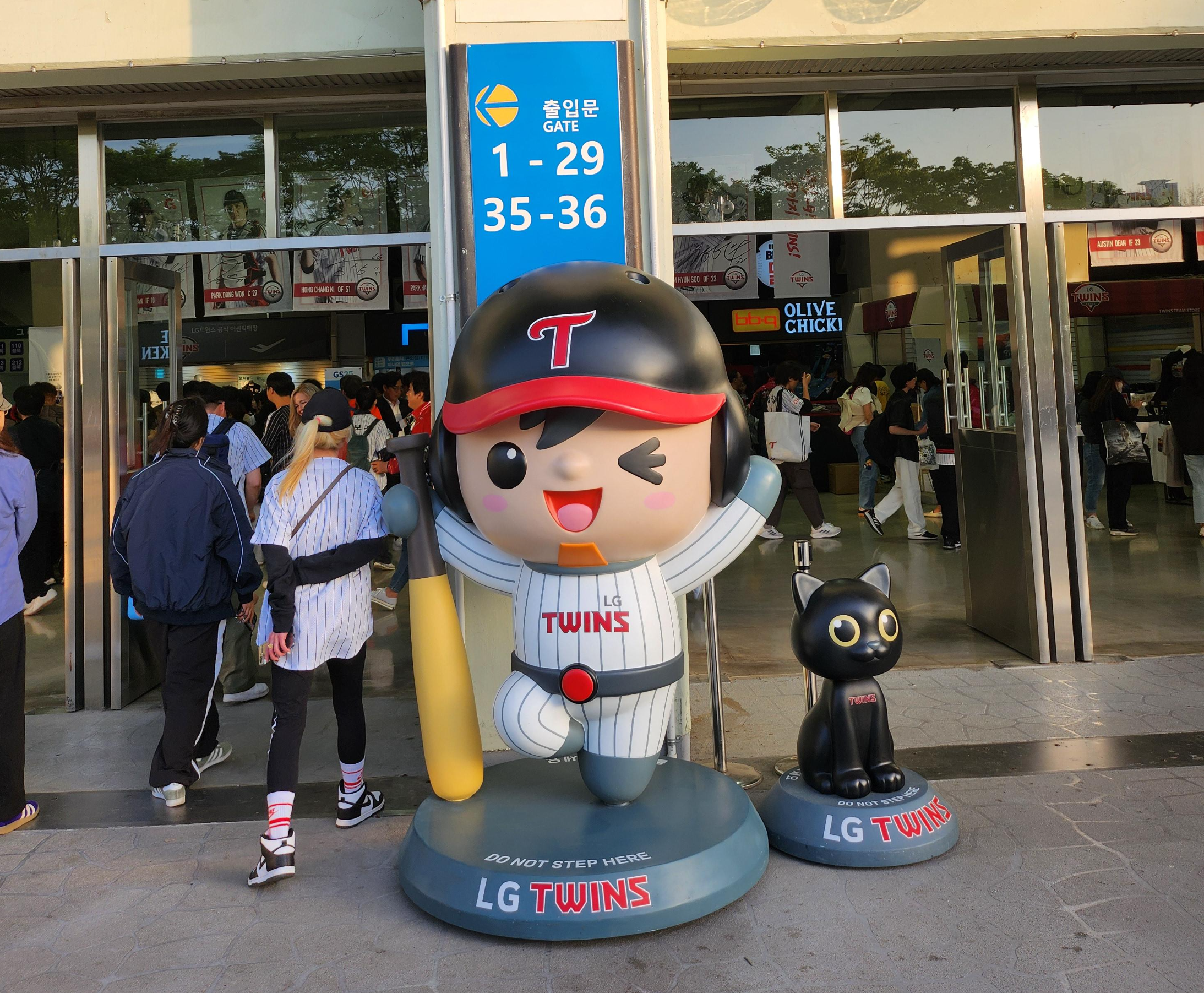 1루 내야석 입장하니 귀여운 엘지 캐릭터가 있었다. 사진을 찍고 싶었으나 남는 손이 없어서 일단 좌석을 찾으러 들어갔다.