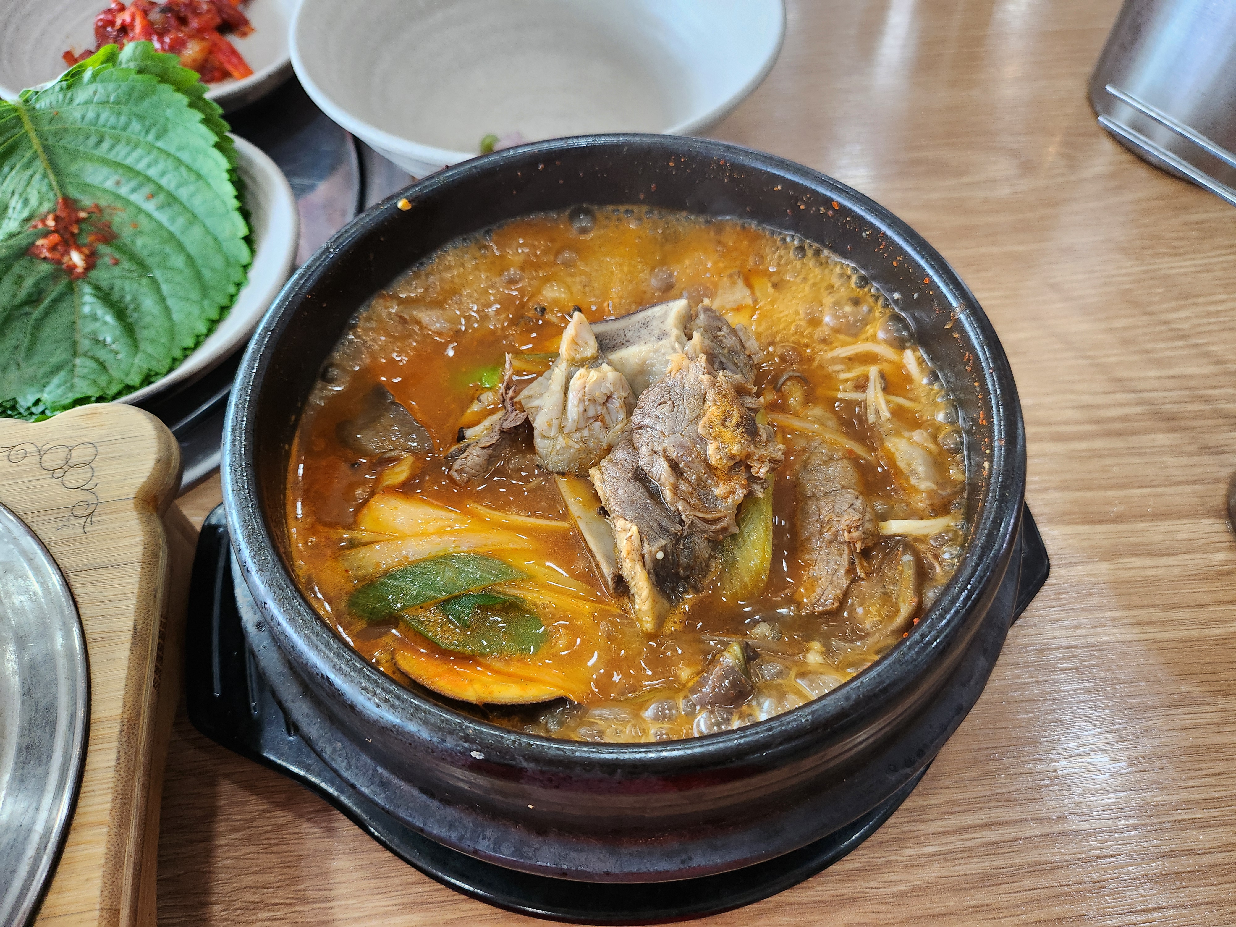 전주혁신도시 찐 맛집 두거리우신탕. 소갈비, 양지, 그리고 각종 버섯과 파, 무를 넣어 만든 얼큰한 소고기탕이 이곳의 대표 메뉴이다. 솥밥과 함께 나오는데 진짜 너무 맛있는 곳! 대표메뉴 우신탕 가격은 13,000원이다.