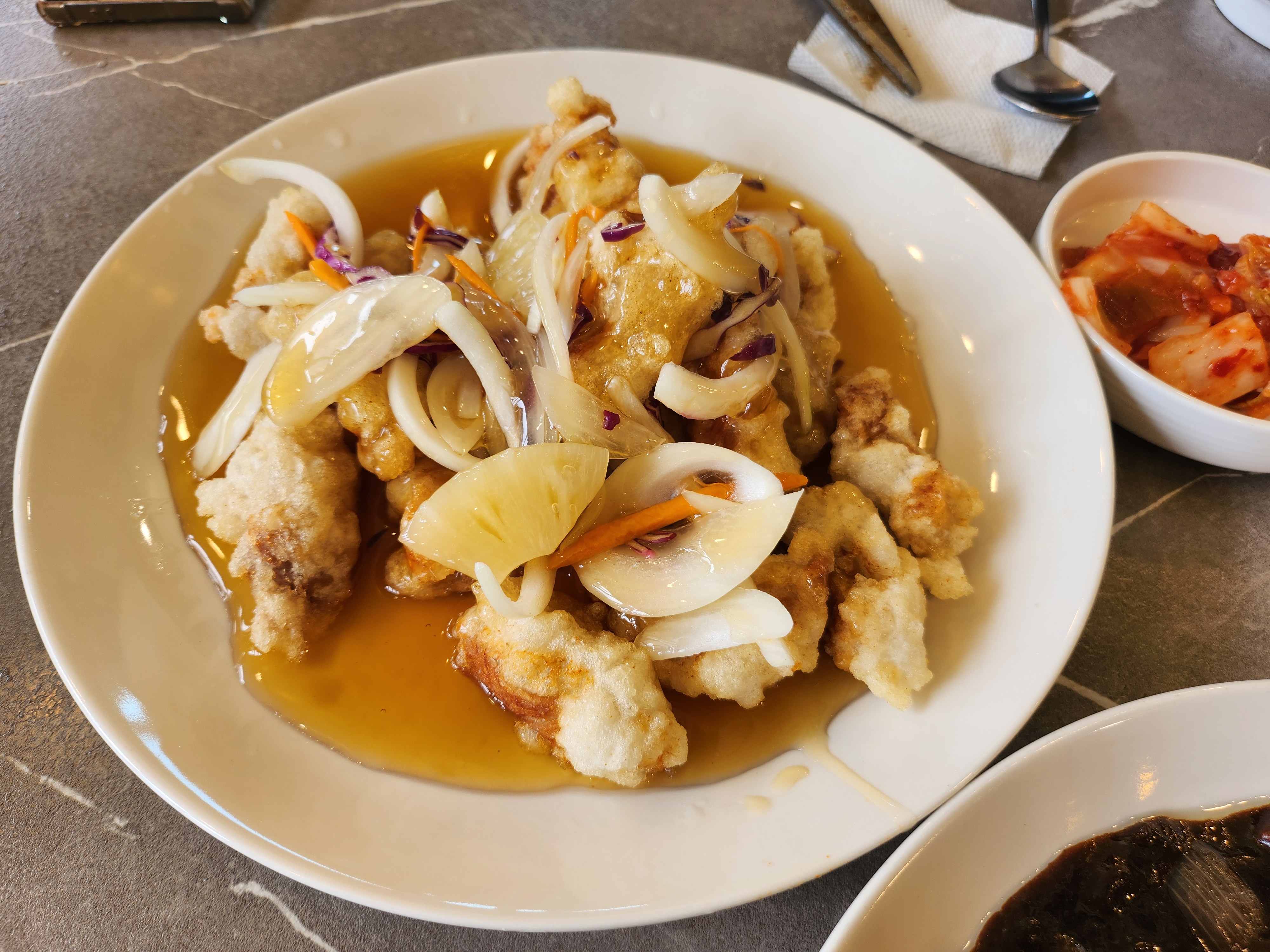 그리고 찹쌀 탕수육도 주문했다. 소자 가격은 15,000원이었다. 새콤달콤 탕수육 소스에 쫄깃한 튀김이 정말 잘 어울렸다. 대천짬뽕집 음식이 정말 맛있었다. 대천해수욕장에서 추천하고 싶은 맛집이다.