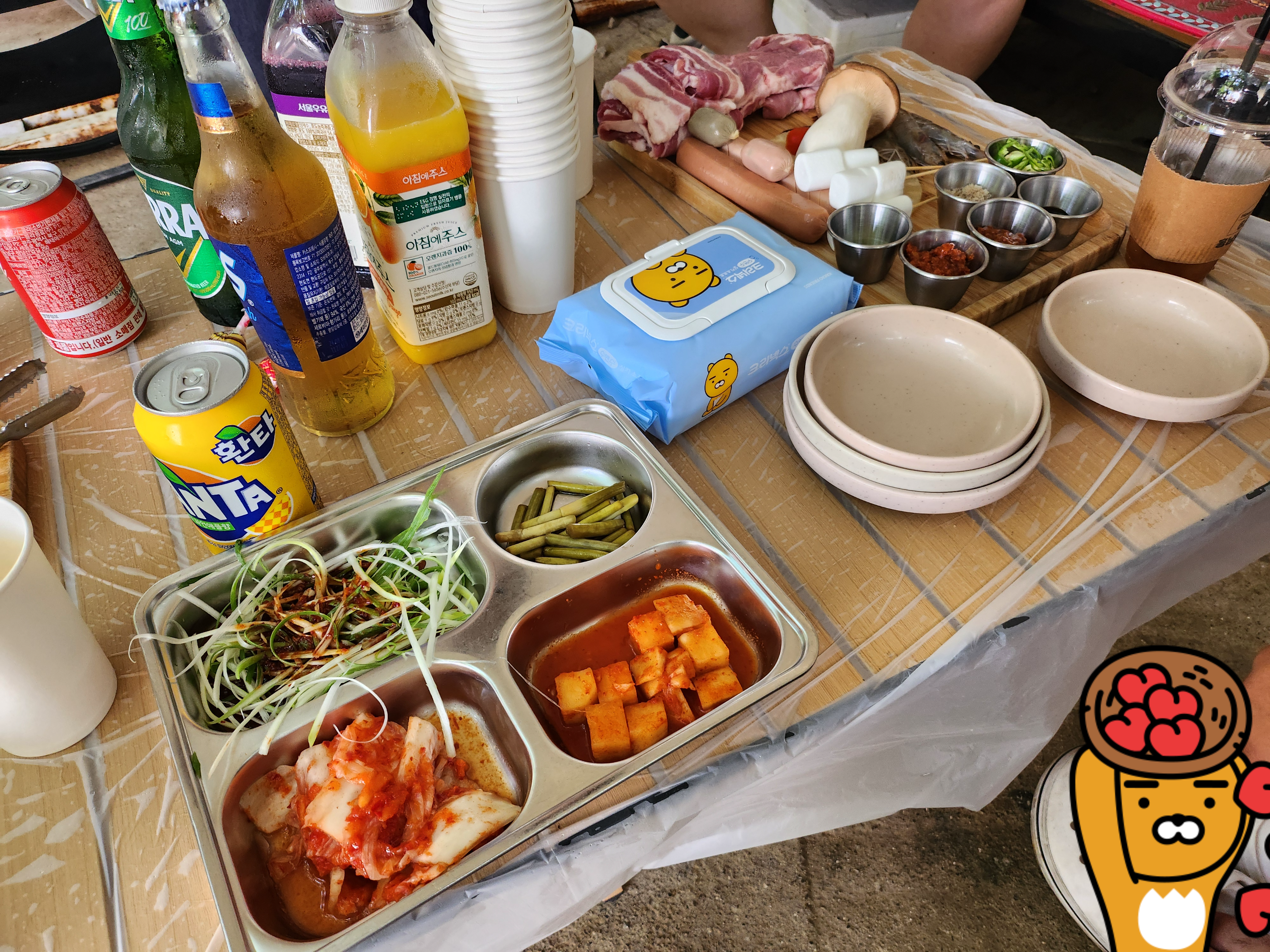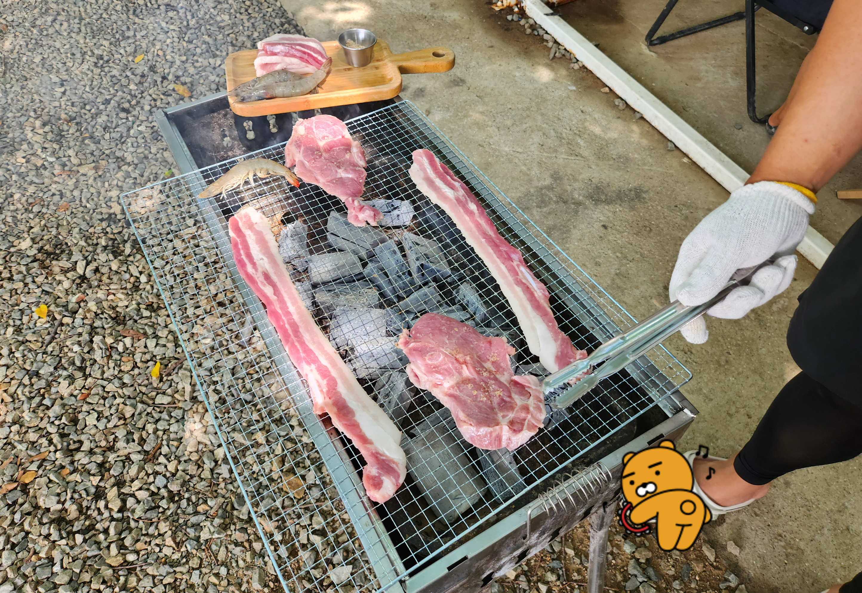 우리는 숯불에 구워 먹었다. 숯불도 포함되어 있고 숯불 추가도 공짜였다. 다만 한여름이라 몹시 더우니 고기 굽는 사람의 희생이 필요하다... 남편 감사해♥ 고기가 부족해서 고기추가 600g (가격은 5만 원)을 했다. 가격은 다소 비쌌지만 고기가 신선하고 육질도 좋고 백숙도 너무 맛있었다. 온 가족이 다 만족했다. 굿굿!