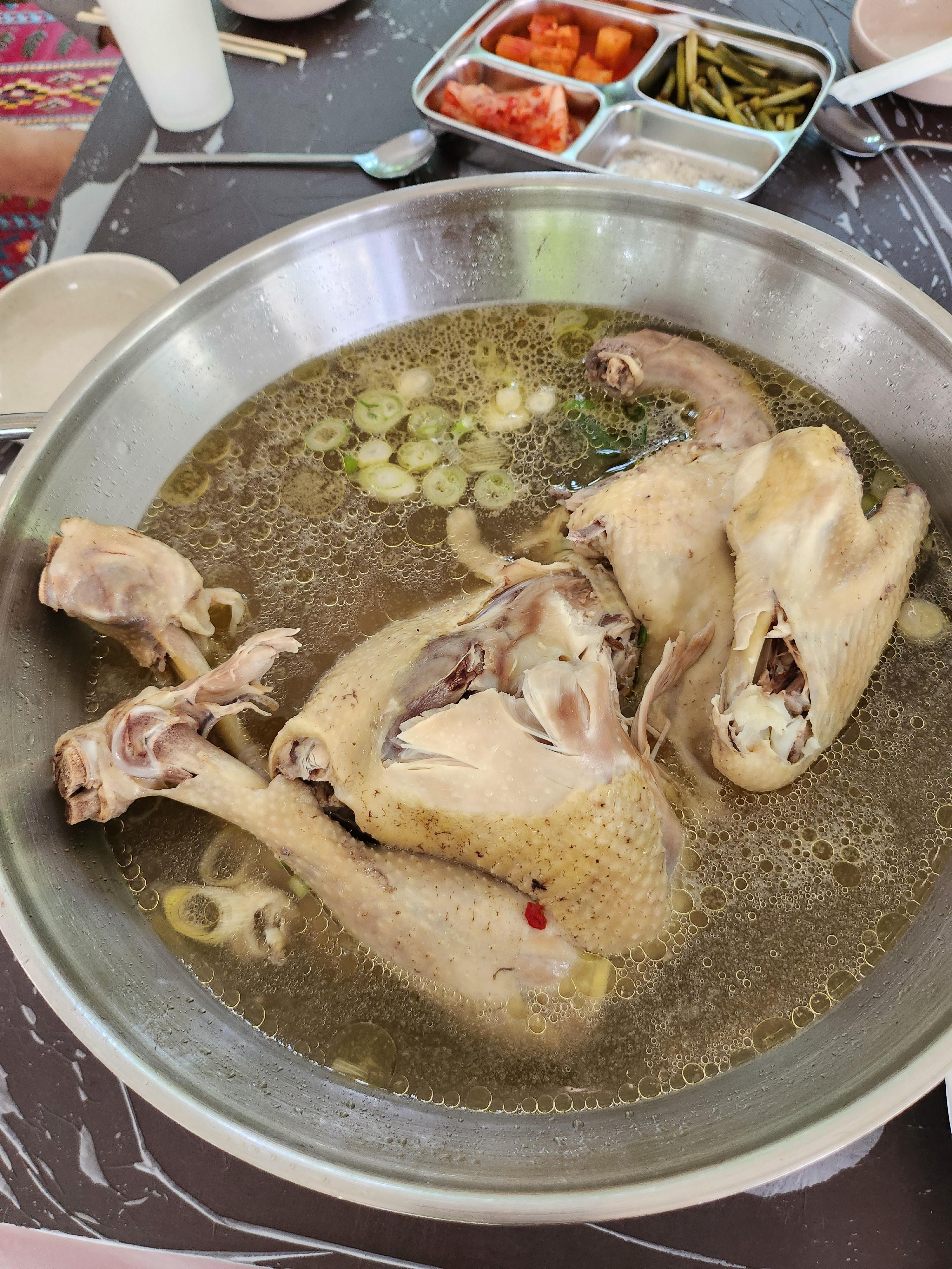 주문한 백숙이 나왔다. 가격은 12만 원이다. 다소 비싸지만 평상 대여료가 포함된 가격이라 그러려니 했다. 토종닭이라 닭이 크고 푸짐했다. 같이 나온 반찬들도 맛있었다. 깍두기, 배추김치, 마늘쫑, 소금 등은 셀프코너에서 계속 리필해서 먹을 수 있었다.