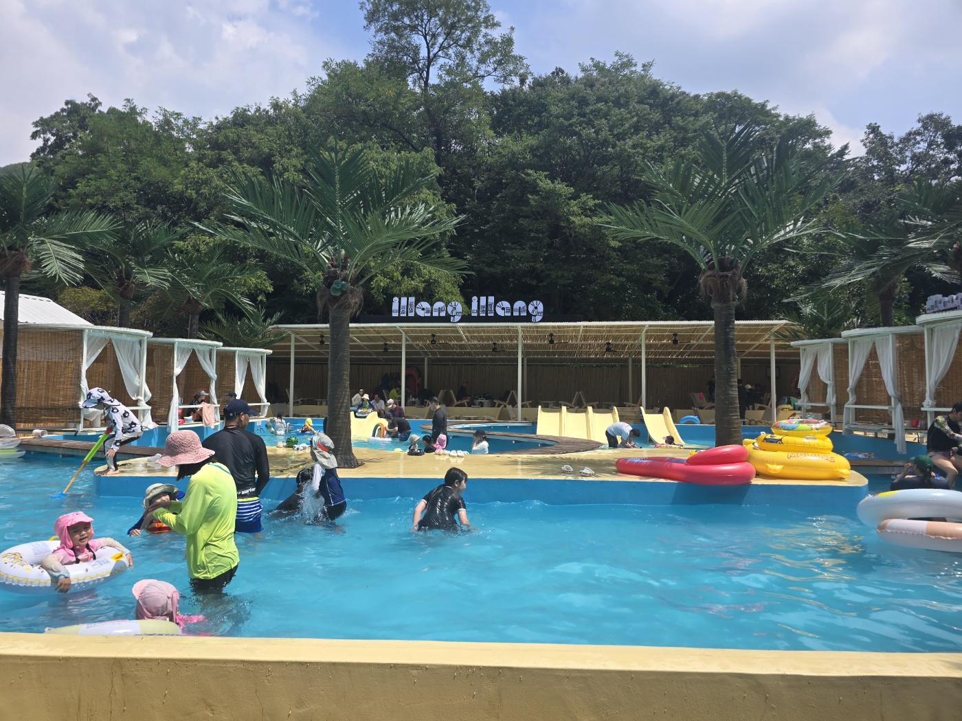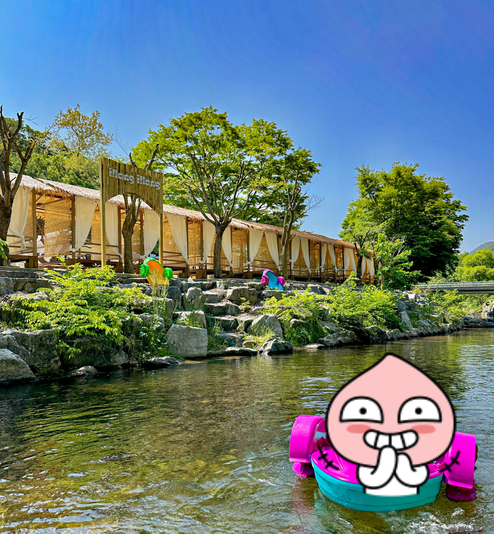 배 든든히 채우고 놀거리를 찾아 나섰다. 일랑일랑 & 서울가든은 놀거리가 많아서 아이들과 함께 오기 참 좋은 피서지이다. 일단 일랑일랑 내 온수풀, 마당에서 하는 버블파티, 트램펄린, 모래놀이터도 있고, 계곡에서는 페달보트도 탈 수 있다.