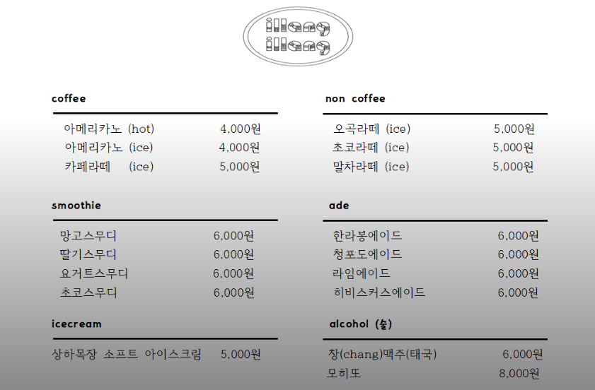일랑일랑에서 운영하는 카페 메뉴판도 가져와봤다. 커피, 스무디, 아이스크림, 라떼, 에이드류를 판매한다. 참고로 일랑일랑의 라떼류는 우유 대신 대체유(오트유였던 듯)가 들어간다.