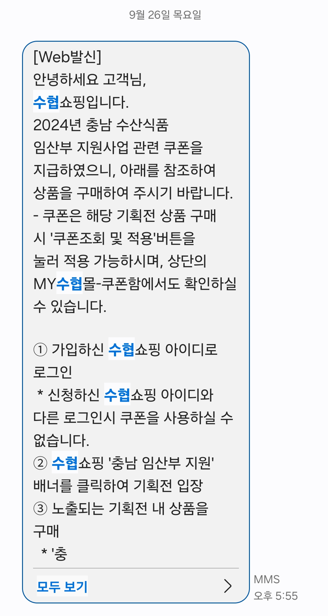 9월 중순 대상자에 선정되었다는 문자를 받았다. 그리고 9월 19일에 수협쇼핑에 쿠폰이 예정대로 지급되었다.