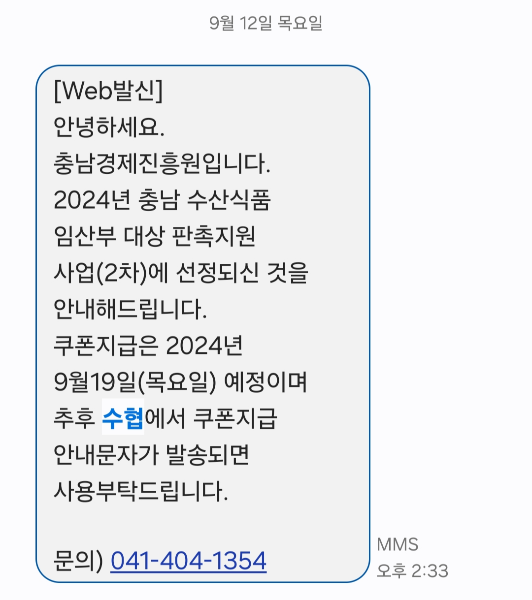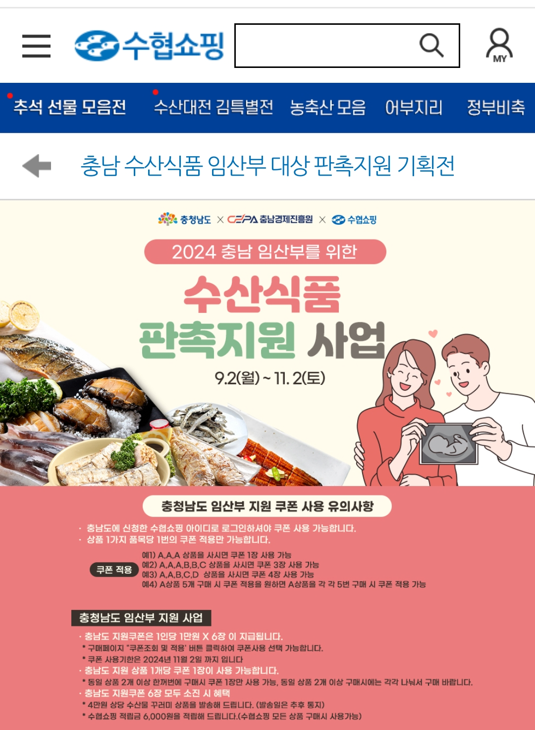 9월 초 친한 언니가 아침부터 카톡 하나를 보냈다. 2024 충남 수산식품 임산부 대상 판촉 지원 사업을 한다며 신청해 보라고 했다. 아는 언니 덕분에 누구보다 빠르게 신청을 해서 350명 선착순에 들어서 해당 사업의 혜택을 받을 수 있었는데 그 후기를 적어본다.