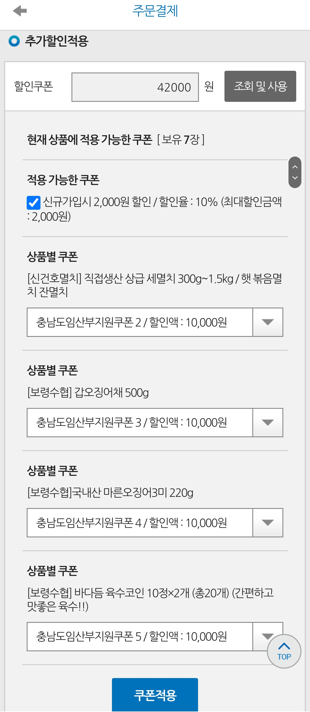 나는 갑오징어채(생물), 마른오징어, 육수코인, 멸치를 구입했다. 주문 결제 창에서 쿠폰 적용을 하면 된다. 신규가입 쿠폰과 중복 사용도 가능해서 총 42,000원 할인받았다. 총 상품금액은 4개 상품 합계 54,200원인데 할인받아 본인부담금인 15,200원이었다.