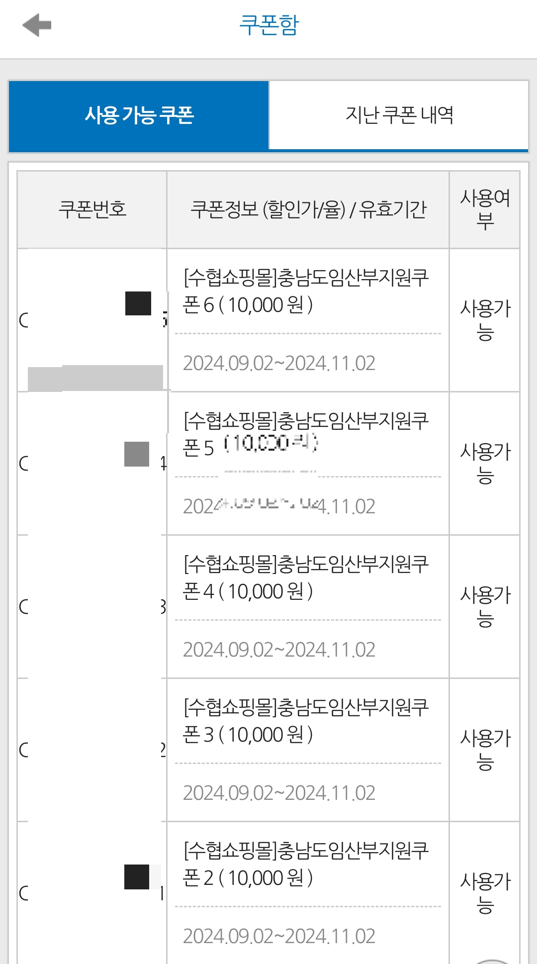 수협 쇼핑에 들어가 쿠폰함 확인부터 했다. 1만원권 6장이 발행되어 있었다.