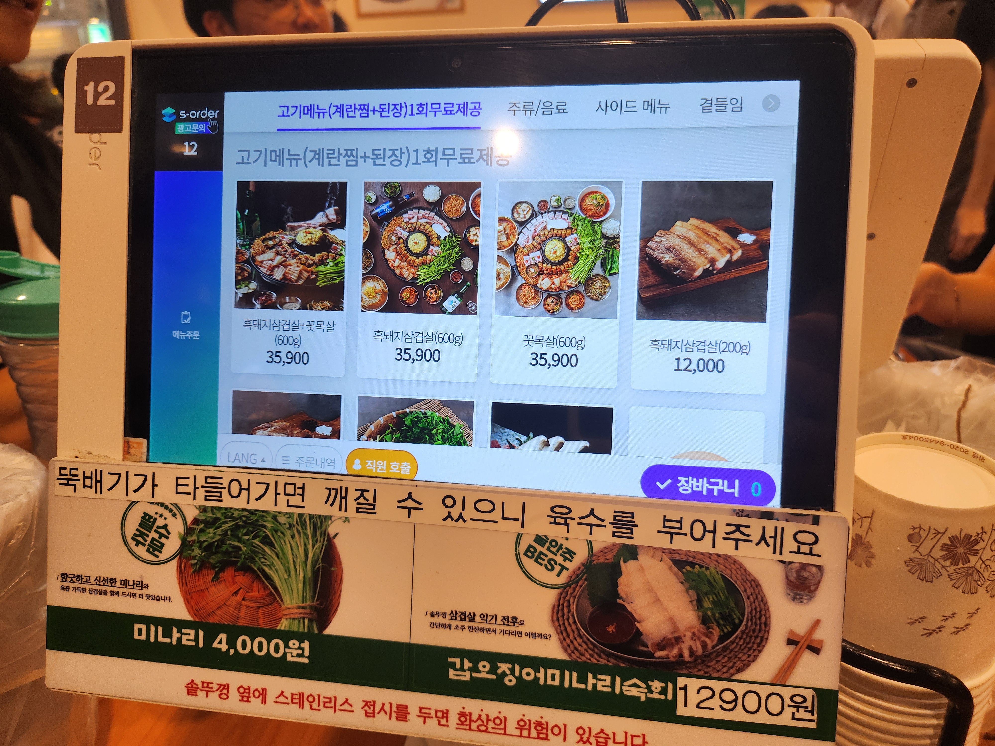 저녁 8시쯤 방문했는데 사람이 많았다. 아슬아슬하게 웨이팅 하지 않고 바로 착석할 수 있었다. 주문은 자리에 있는 키오스크에서 하면 된다. 우리는 성인 2명이었는데 고기는 흑돼지삼겹살+꽃목살(600g) 구성으로 주문했다.