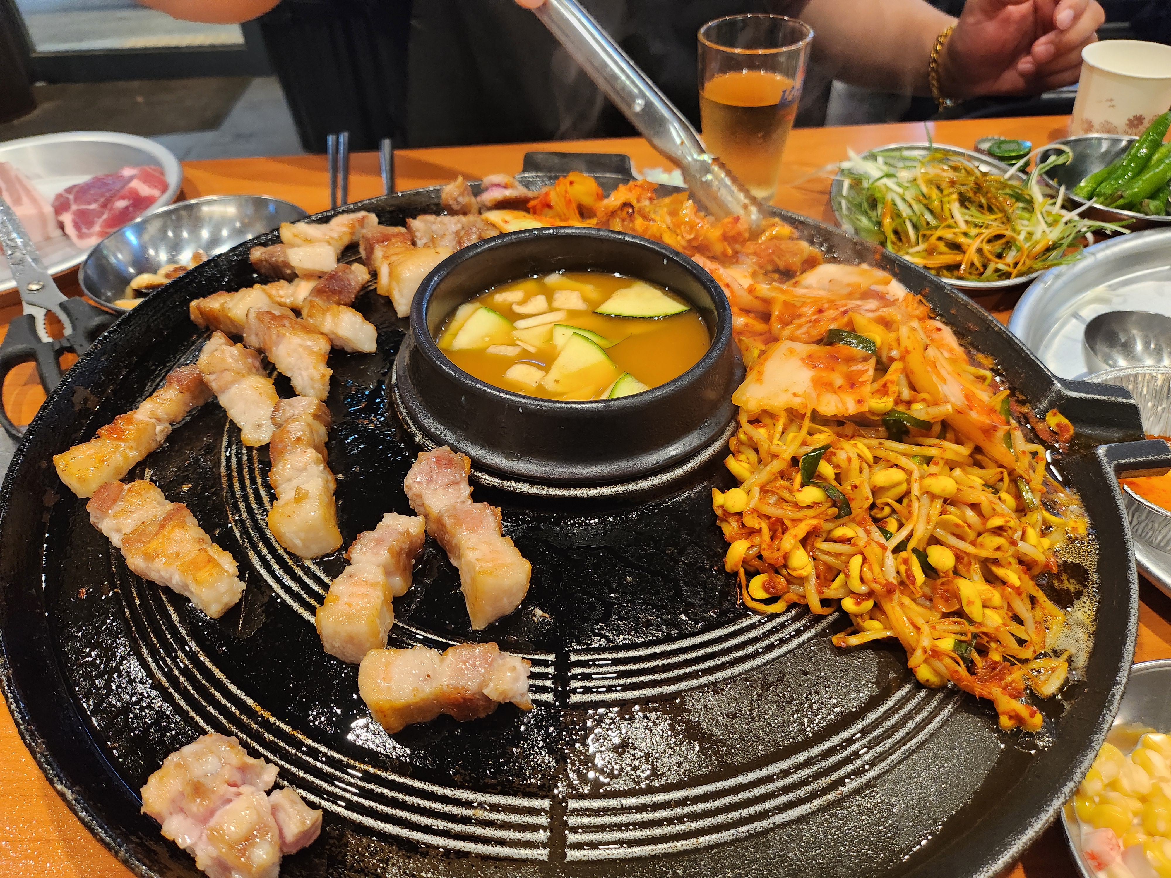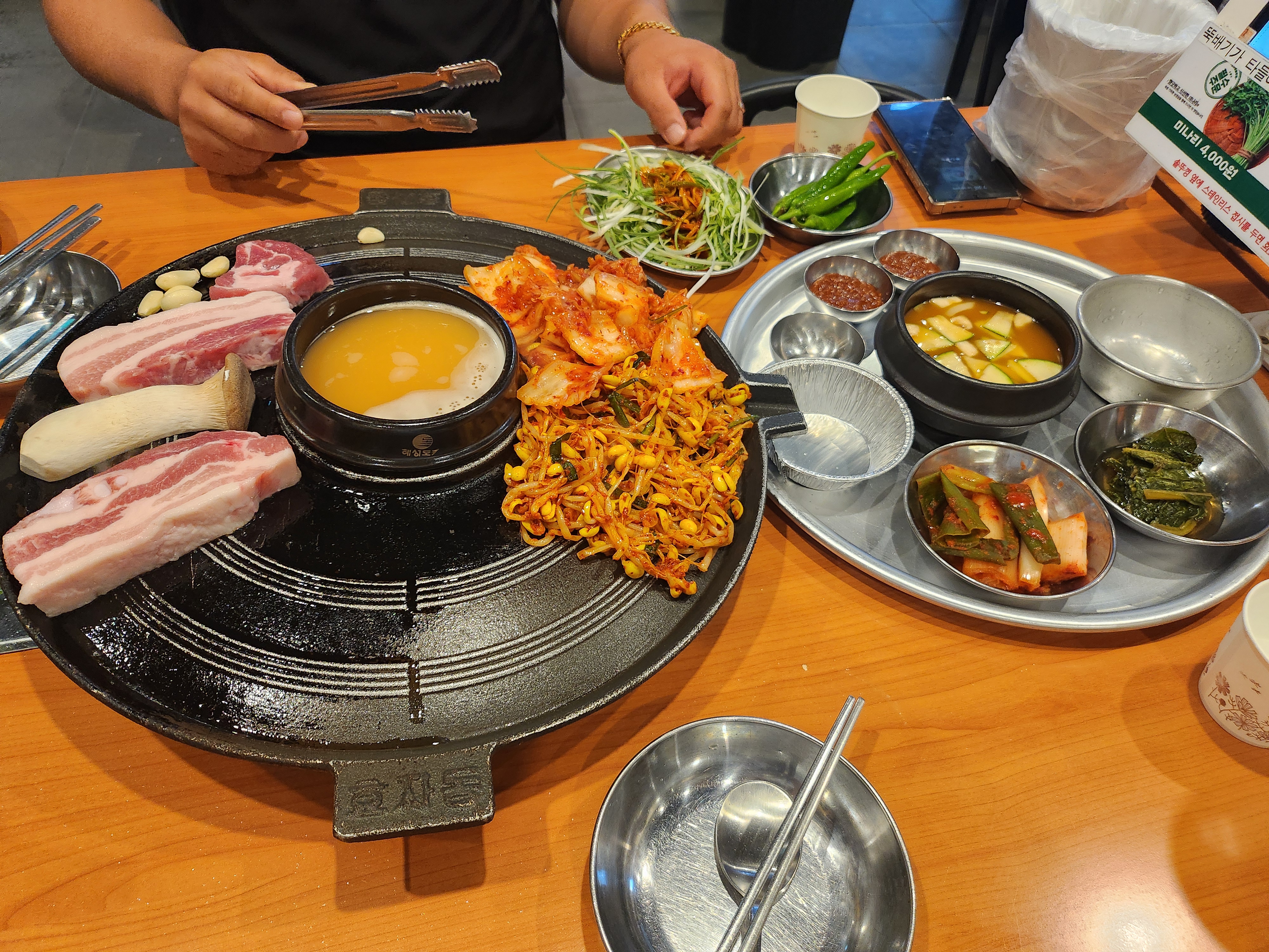 테이블이 세팅되었다. 커다란 솥뚜껑이 놓여졌다. 밑반찬도 빠르게 나왔다. 고기를 주문하면 된장찌개와 계란찜이 포함되어 있다. 기본 반찬은 파채, 청양고추, 파김치, 상추, 깻잎, 콘샐러드, 상추절임(?)이 나온다.
