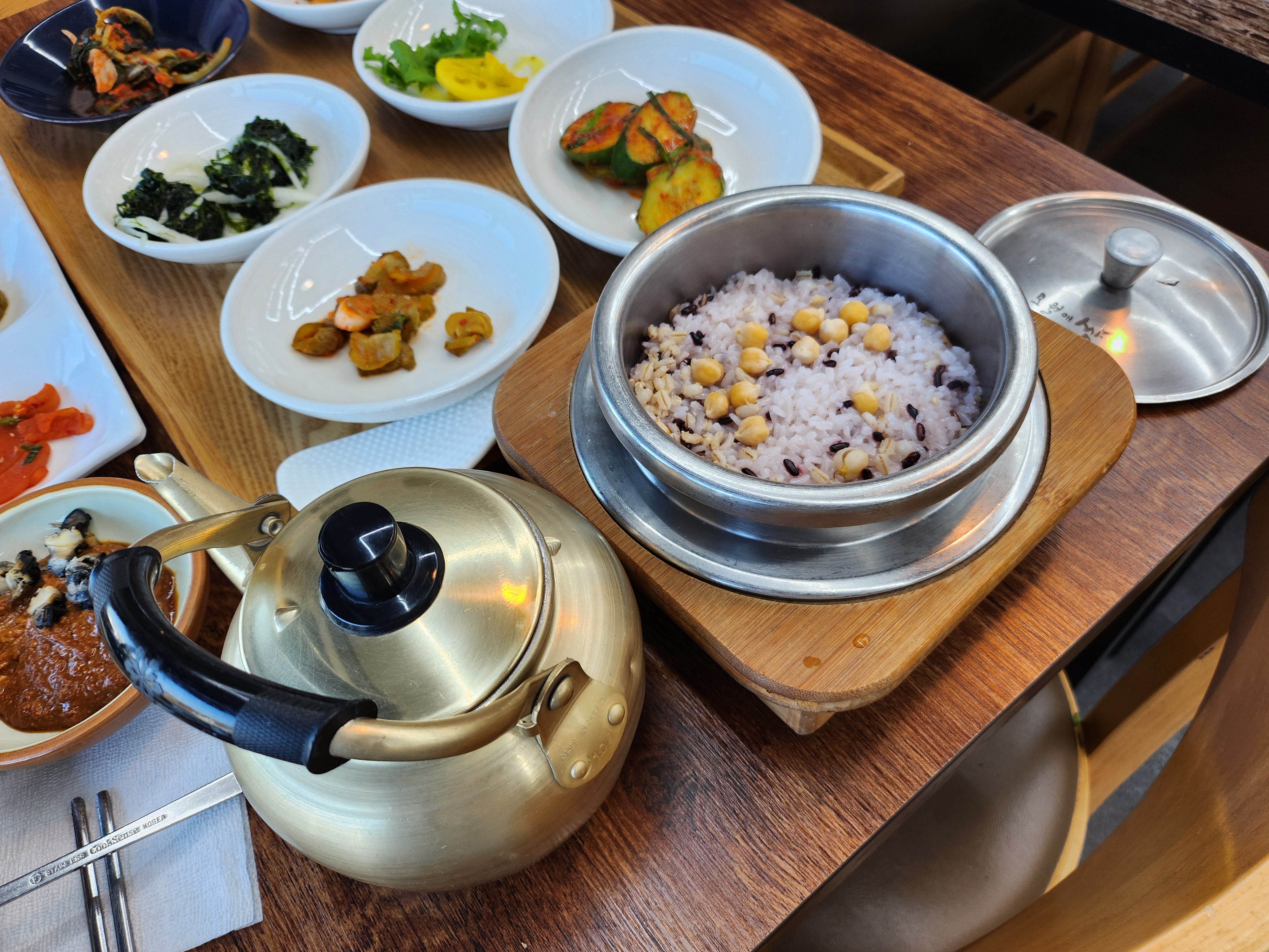 그리고 솥밥까지 모두 나왔다. 솥밥은 1개에 2인분이 나온다. 솥밥에 다양한 잡곡이 들어 있었다. 병아리콩, 현미, 흑미 등이 들어 있었는데 찰지고 맛있었다.
