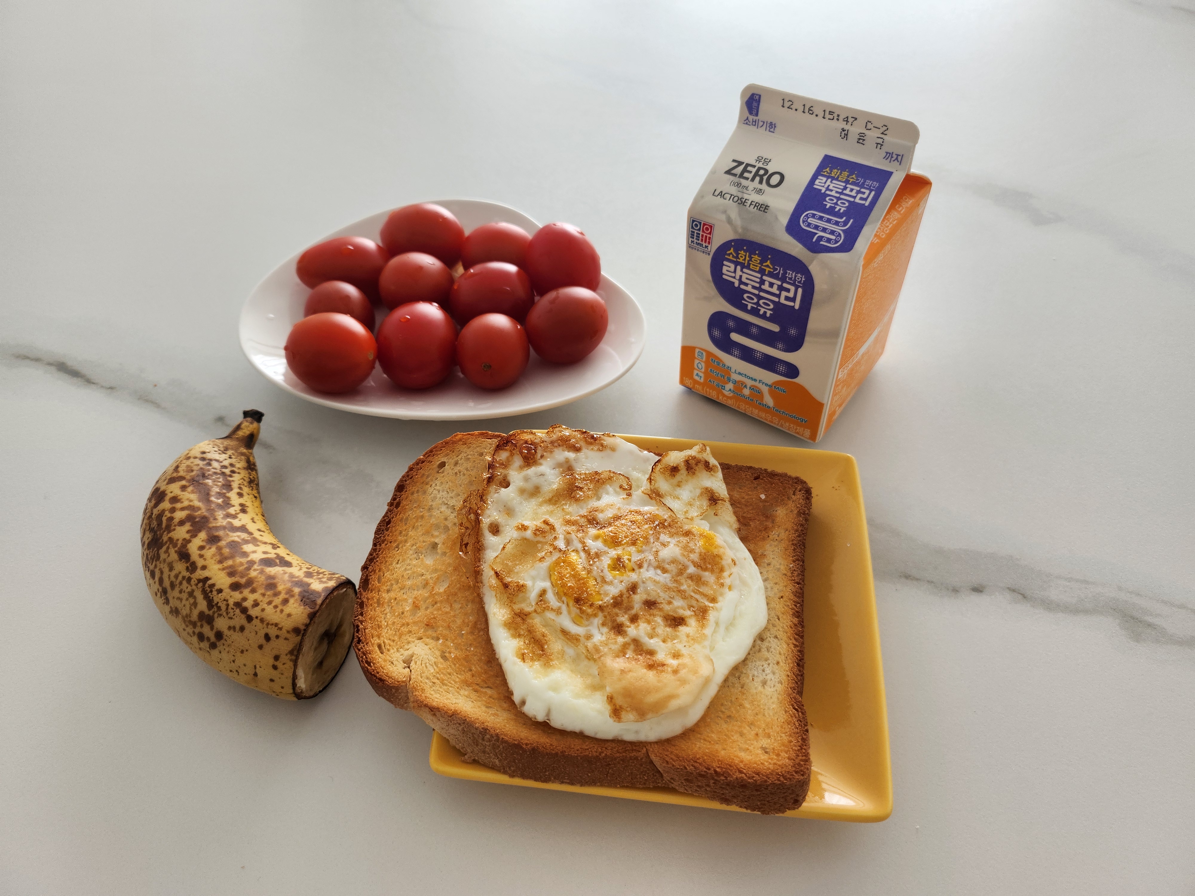 임산부 필수 단백질 섭취 식품은 달걀이다. 삶은 달걀이 제일 좋지만 의사 선생님께서 계란프라이도 괜찮다고 하셨다. (그나마 나는 임당은 아니어서 그런 듯...^^) 사진에는 그냥 식빵(그냥 집에 있는 거 먹음...)이지만 이건 통밀 식빵 or 잡곡 식빵으로 대체하는 게 좋다.