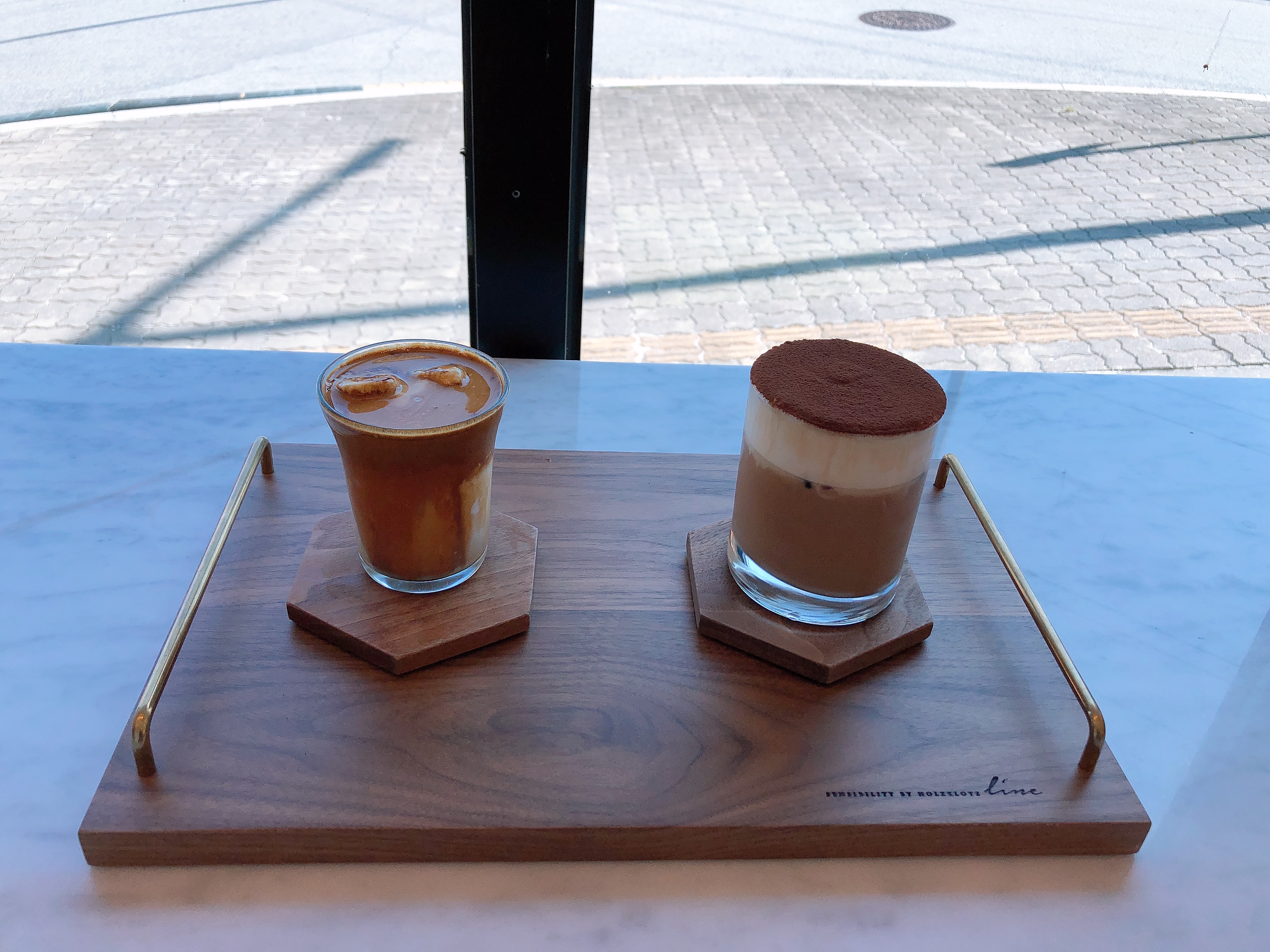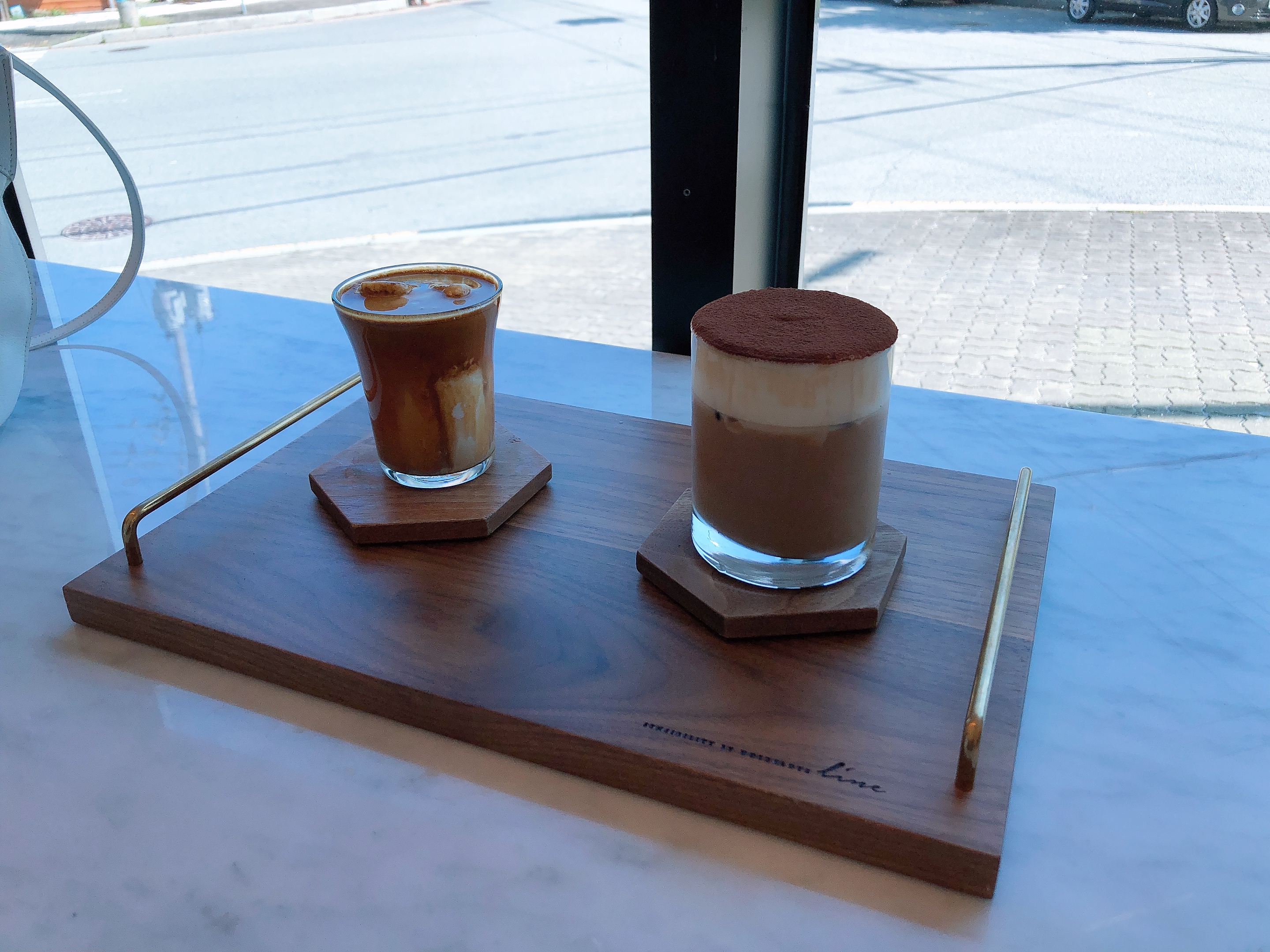 우리는 플랫 화이트 아이스와 크림 모카 아이스를 한 잔씩 주문했다.
