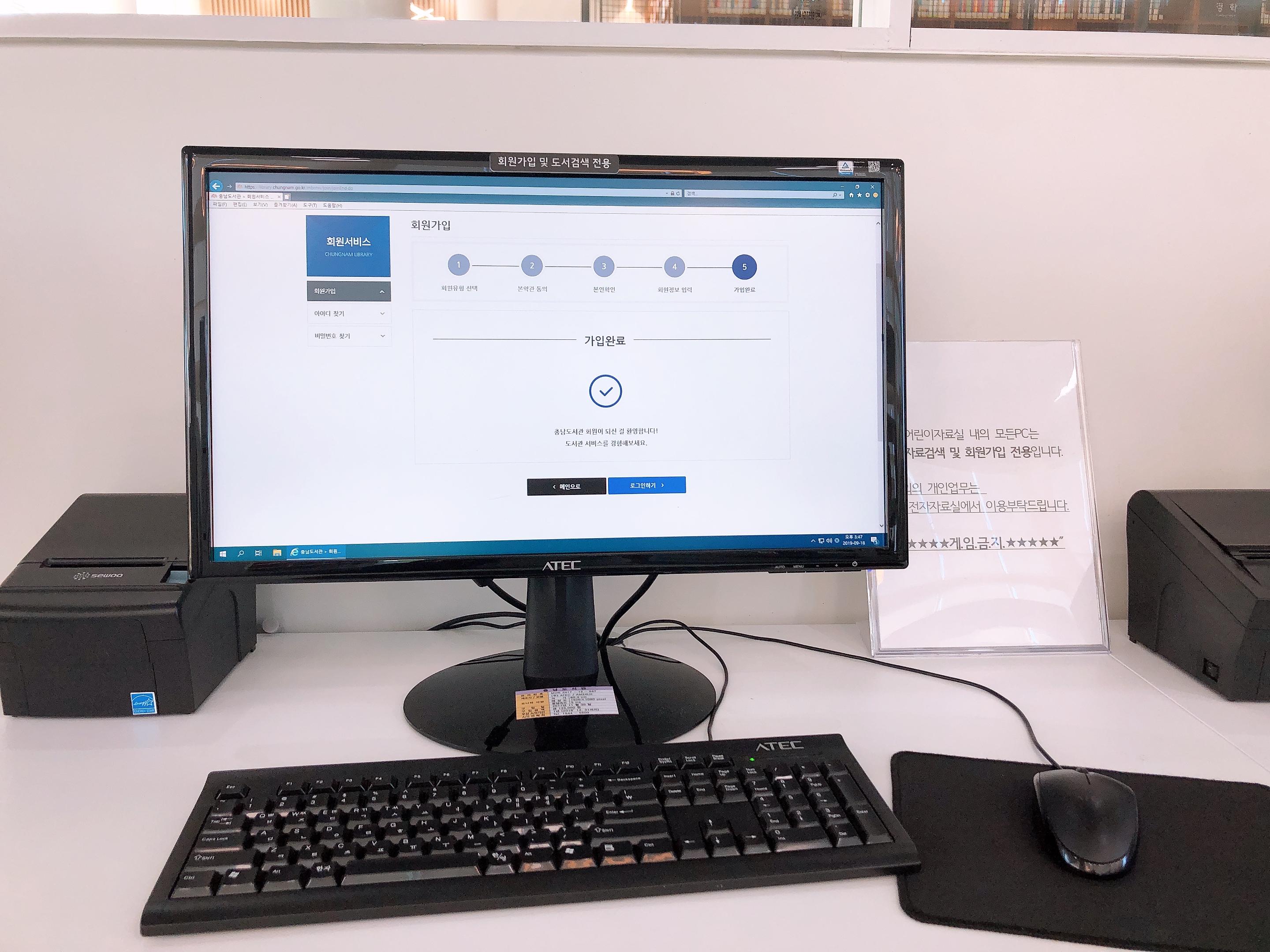 도서관 1층 어린이자료실 내에 회원가입 전용 PC가 마련되어 있으니 이곳에서 회원 가입을 하면 된다.