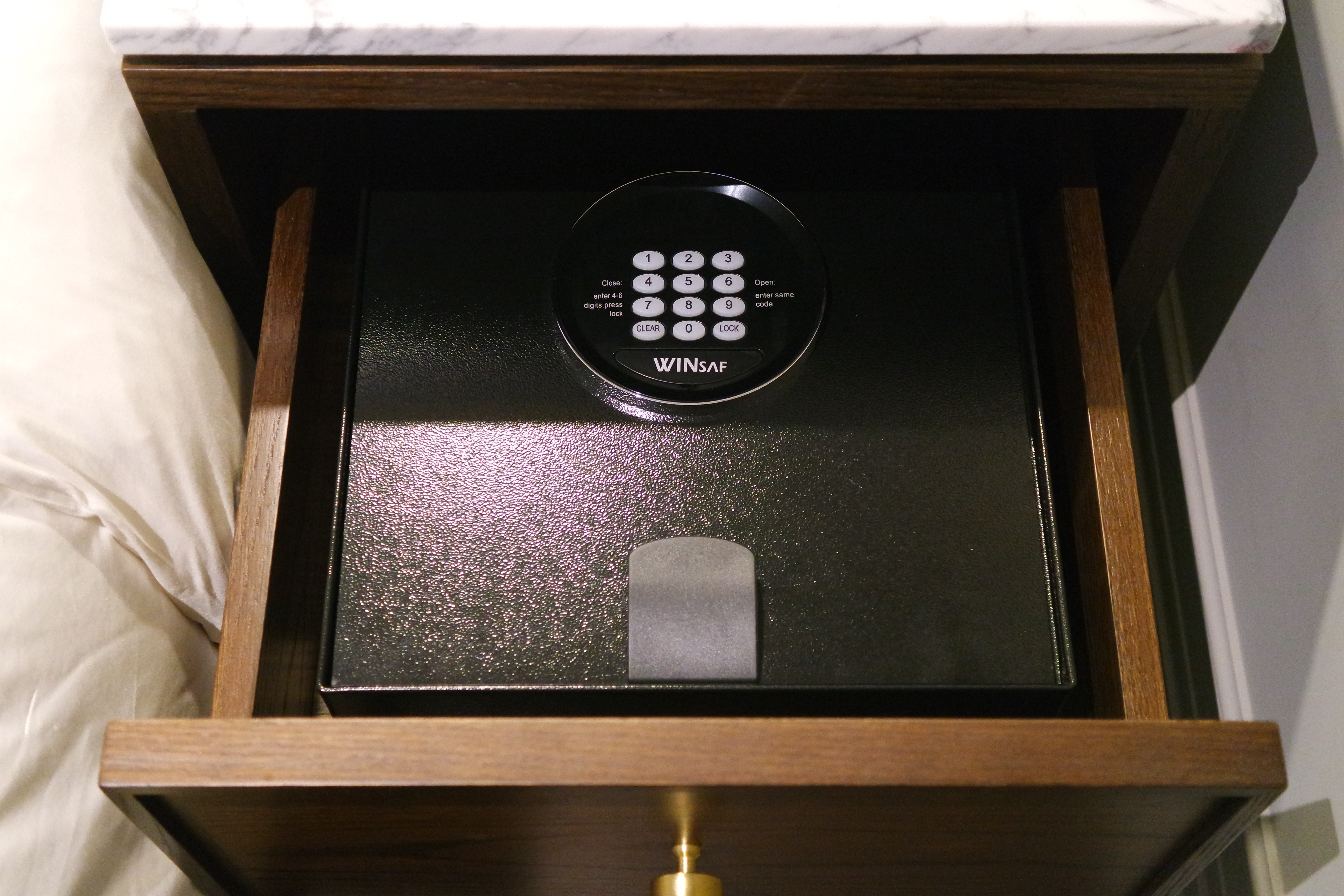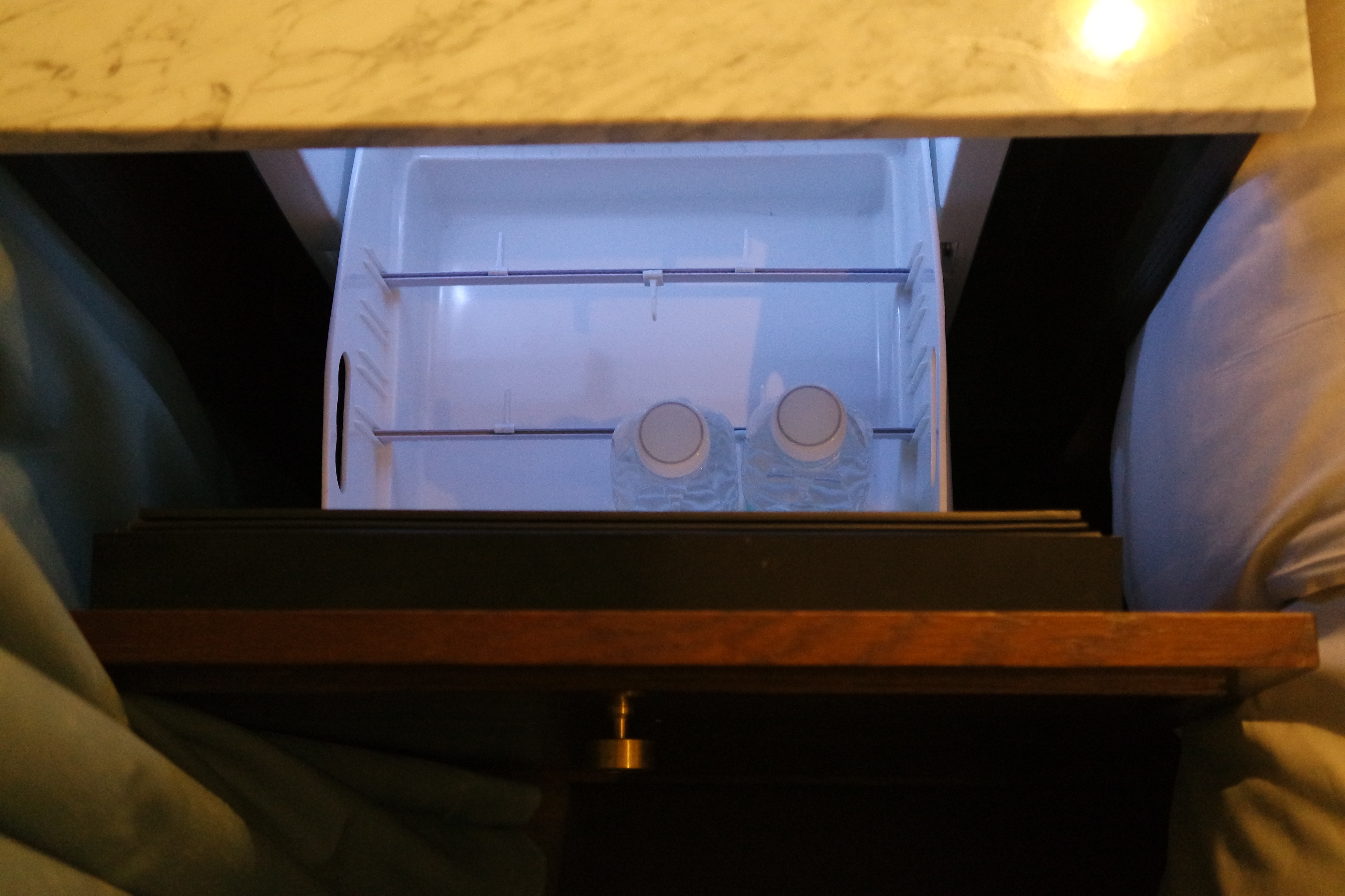 침대 좌우로 미니 냉장고와 금고가 있었다.