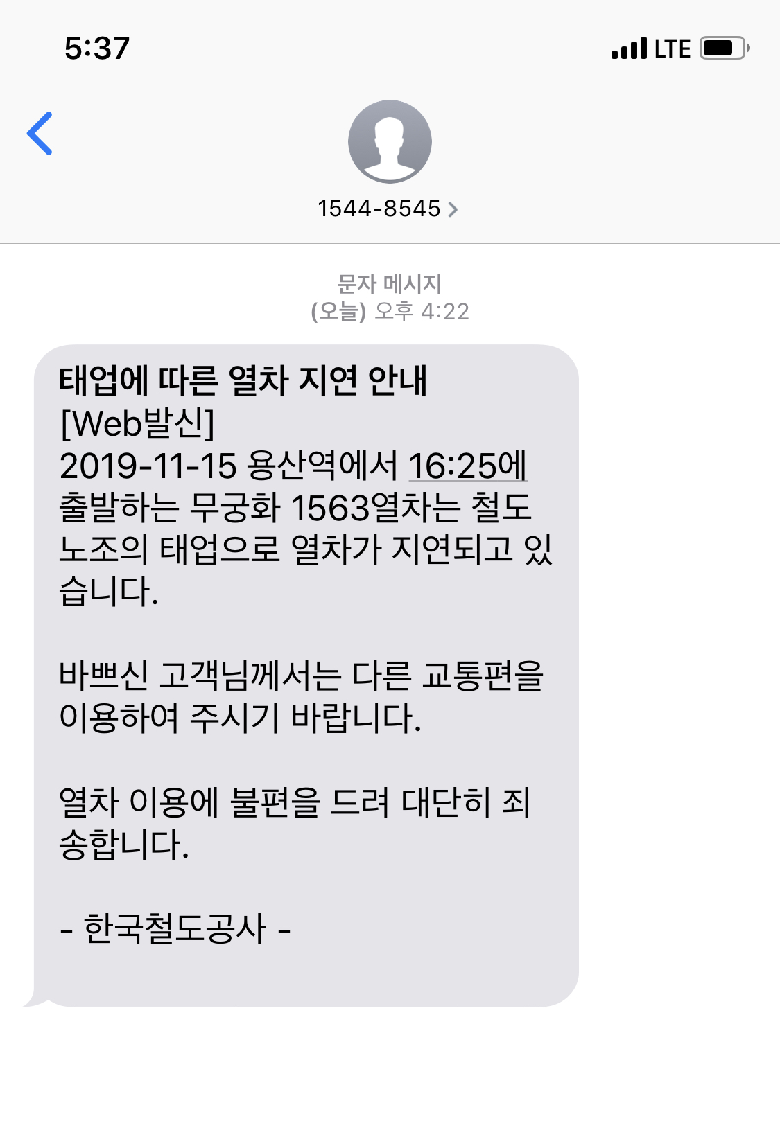 기차를 기다리고 있는데 문자 한 통이 날아왔다.