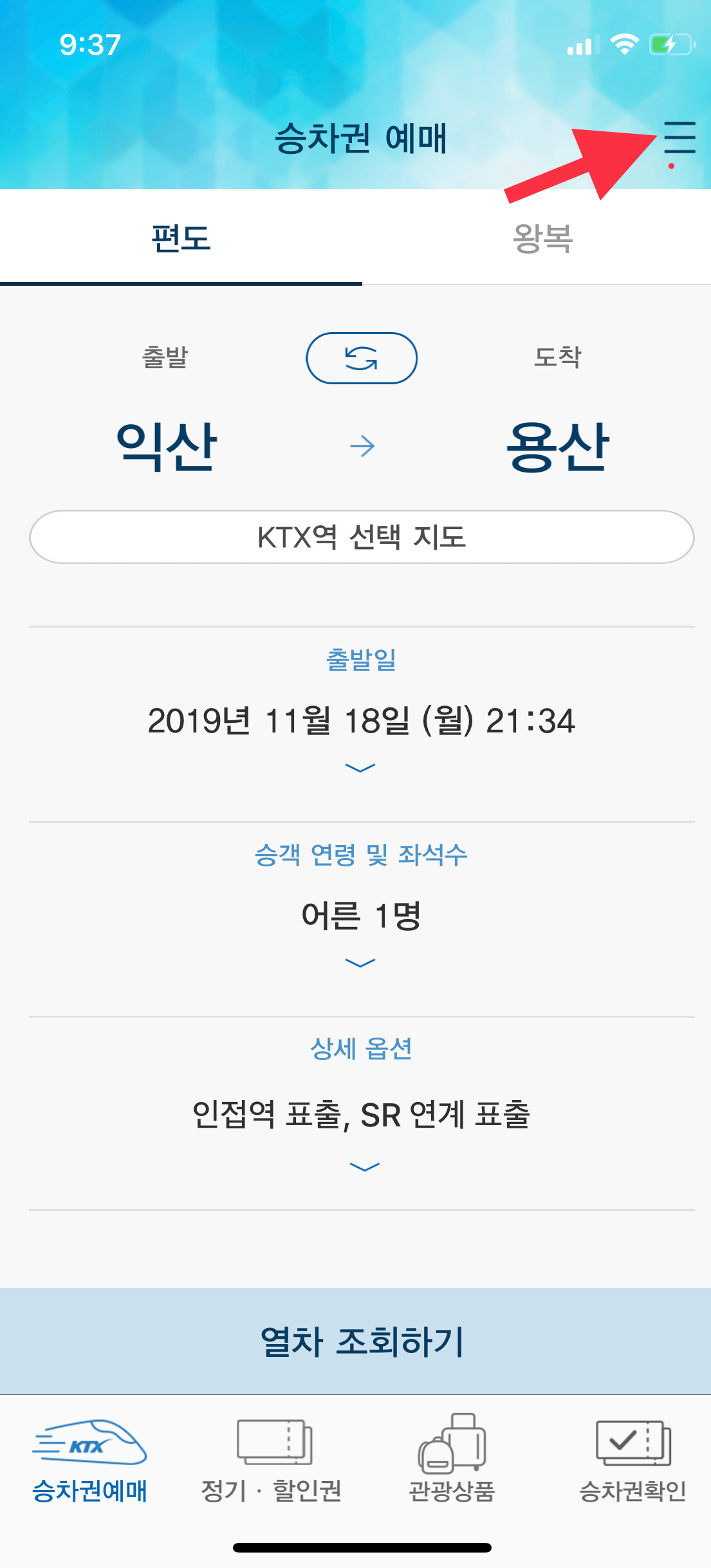 코레일톡 어플 실행 후 오른쪽 상단 메뉴를 클릭한다.