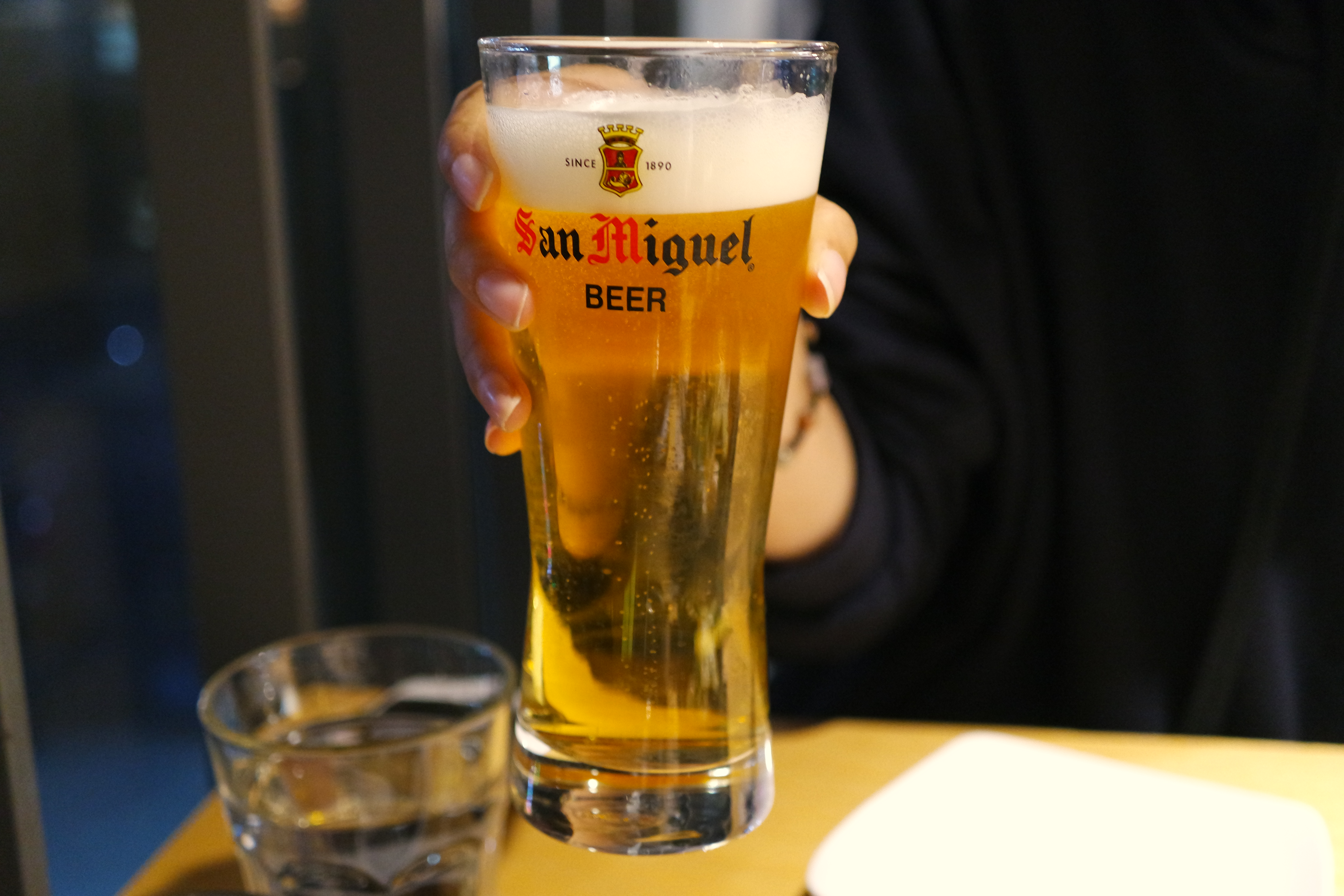 우리는 산미구엘생맥주를 2잔 시켰다.